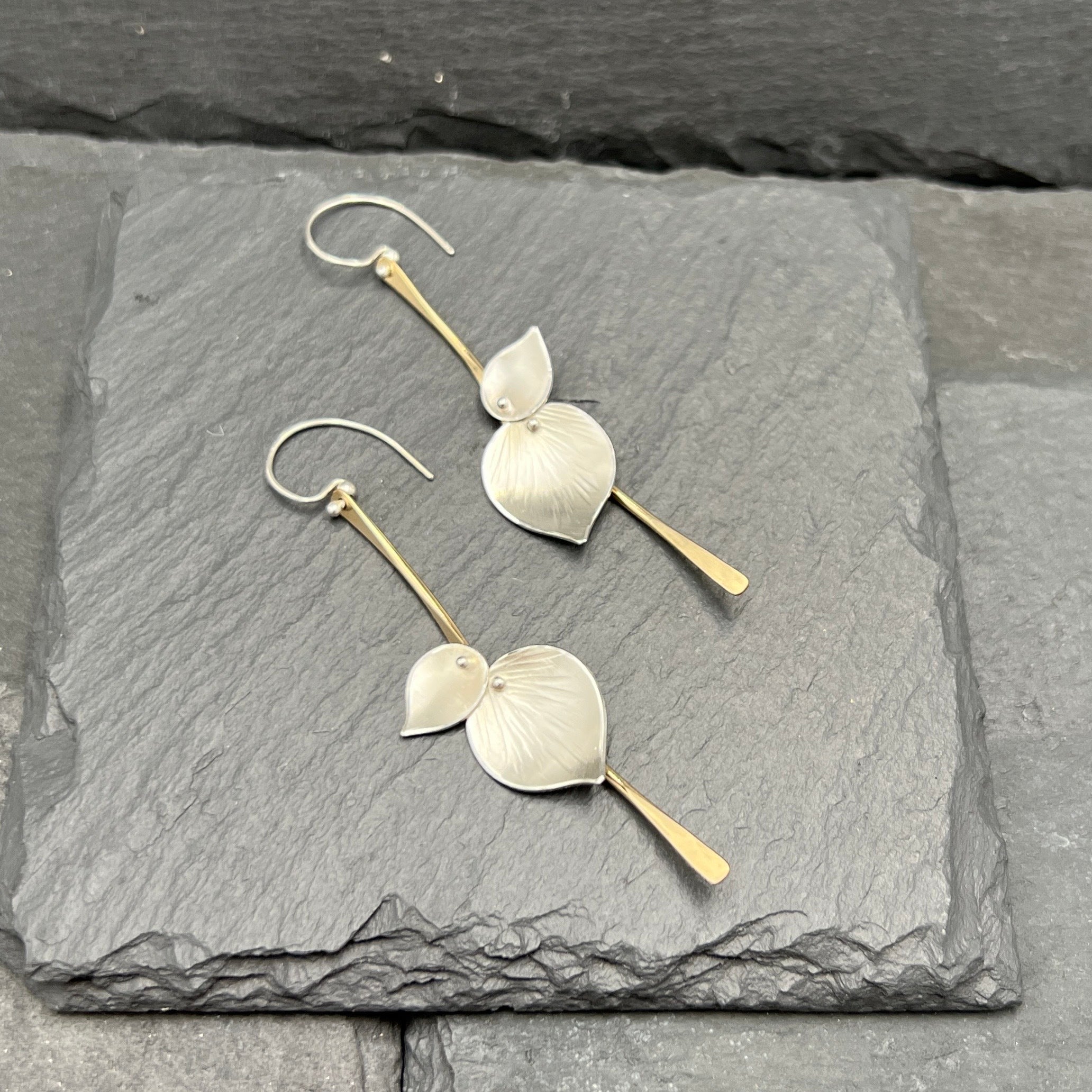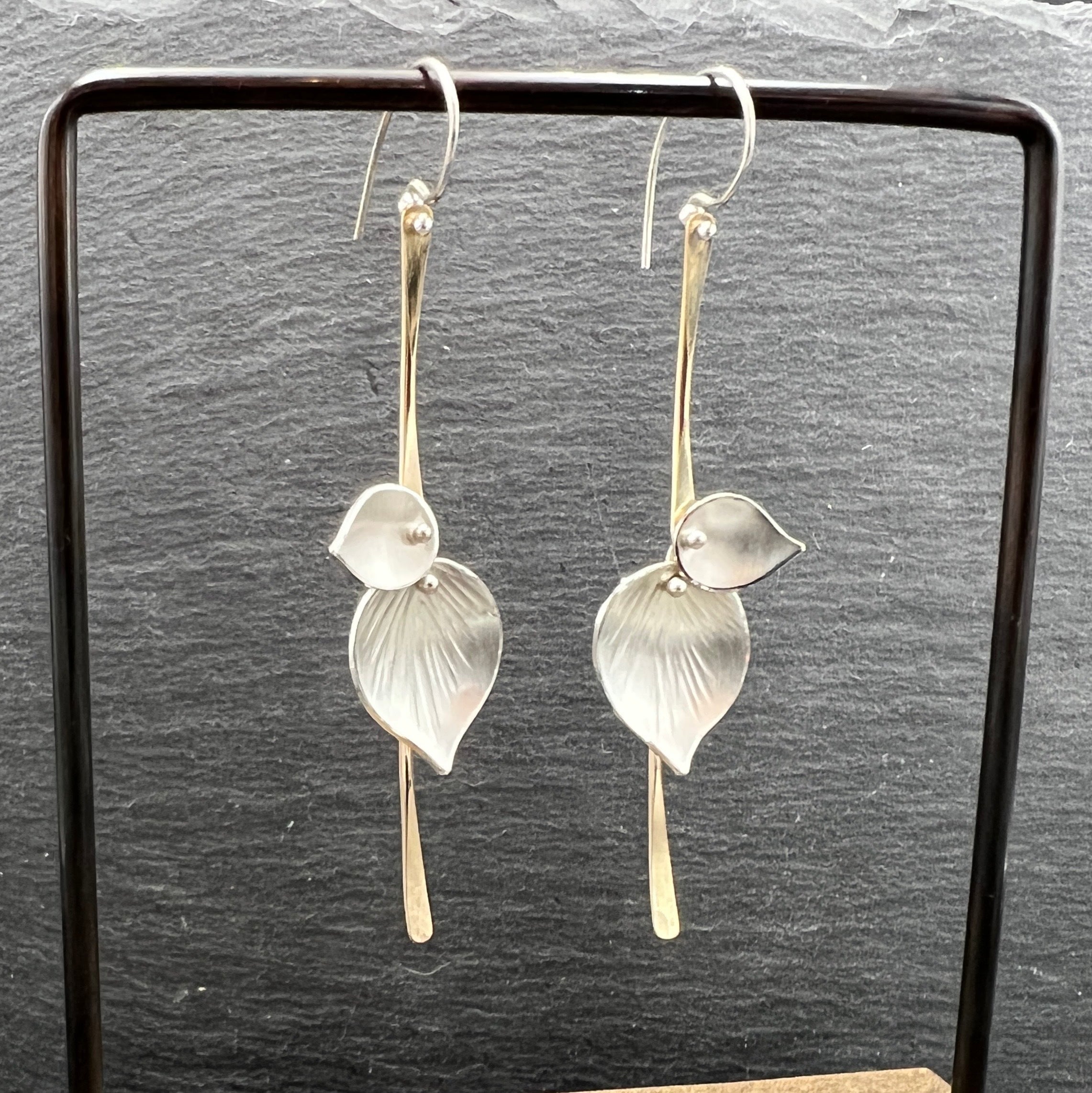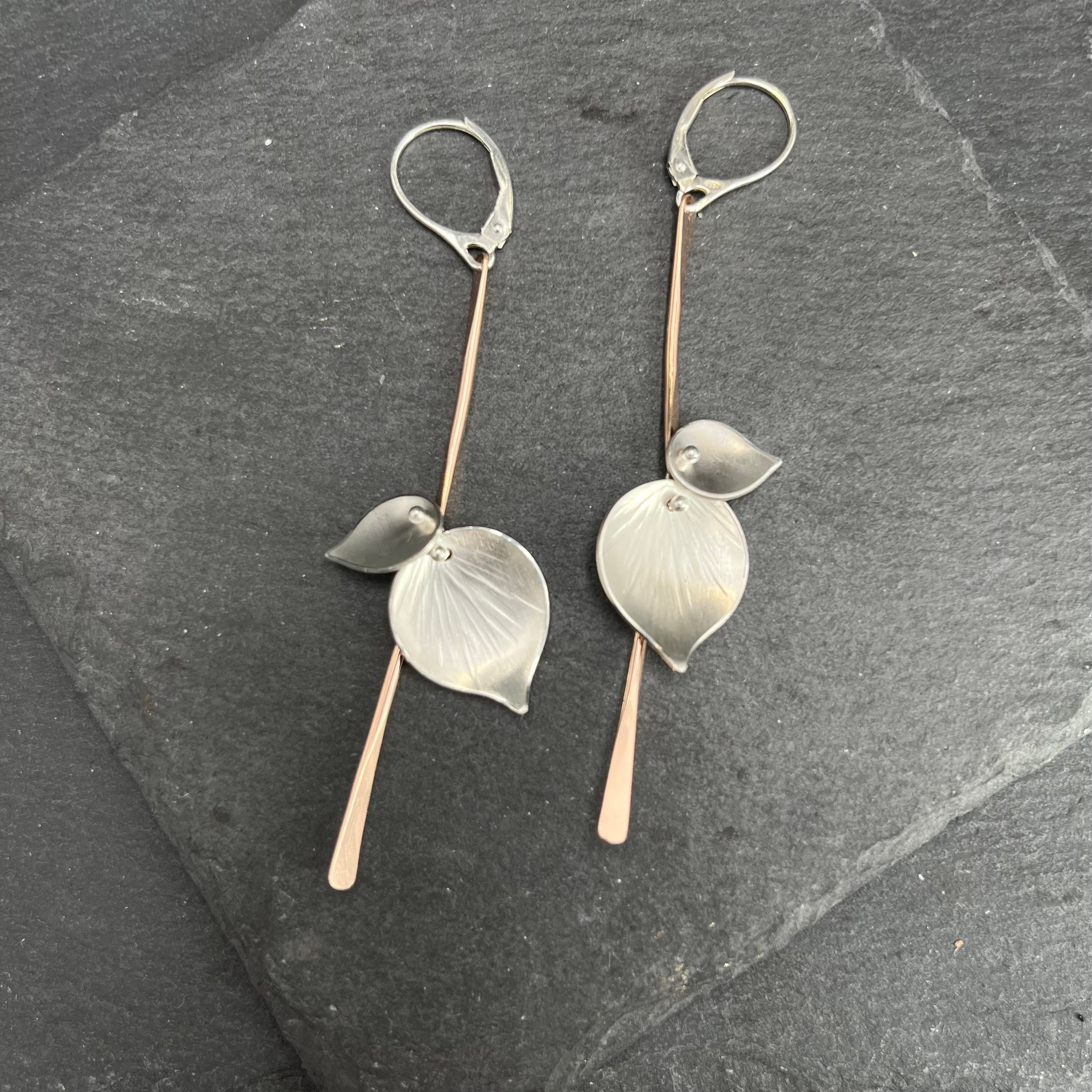 Textured sterling silver leaves dangle in two spots from sterling silver branches. Great movement! Approximately 2.5 inches long and 3/4 inch wide, and available with a polished or oxidized surface.