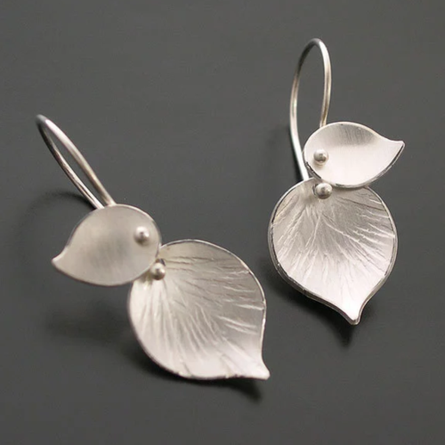 A pair of whimsical textured leaf earrings. Made from sterling silver, these earrings measure 1.25 inches in length.