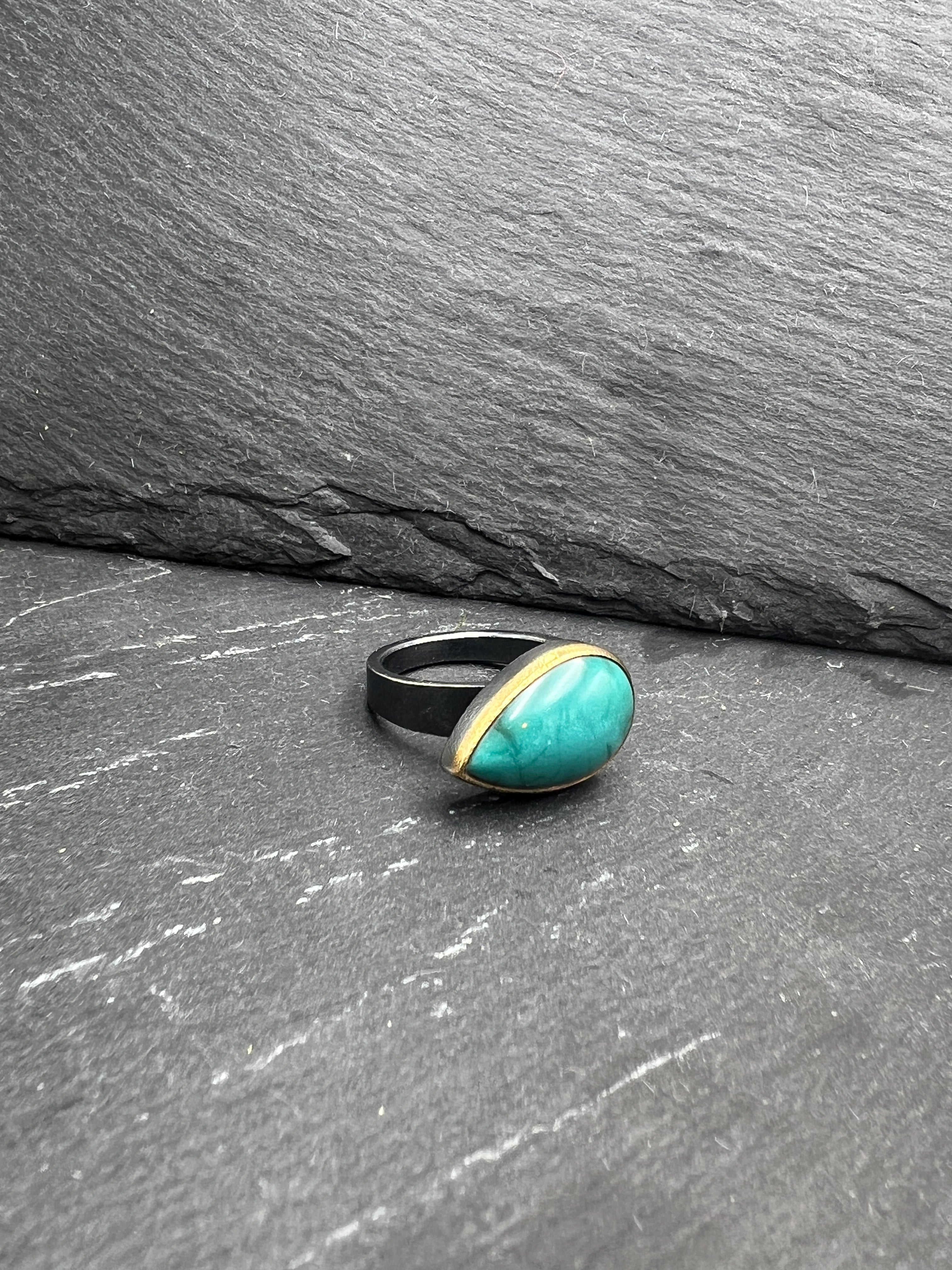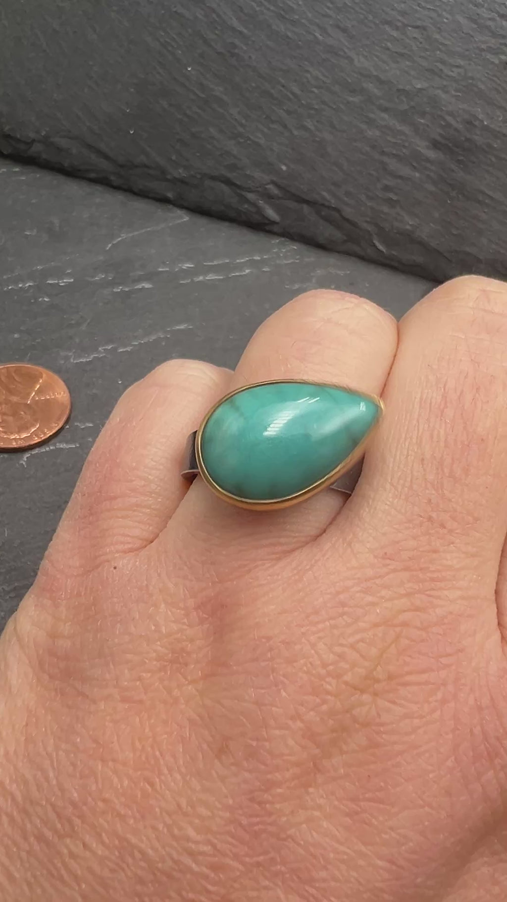 Stunning and fun? Who knew you could have both! This pear shaped turquoise stone is bezeled in 18k yellow gold and oxidized fine silver, set atop of an oxidized silver band, with the ability to spin! Perfect for our fidgety friends. This ring is a size 6.75 and can be resized.