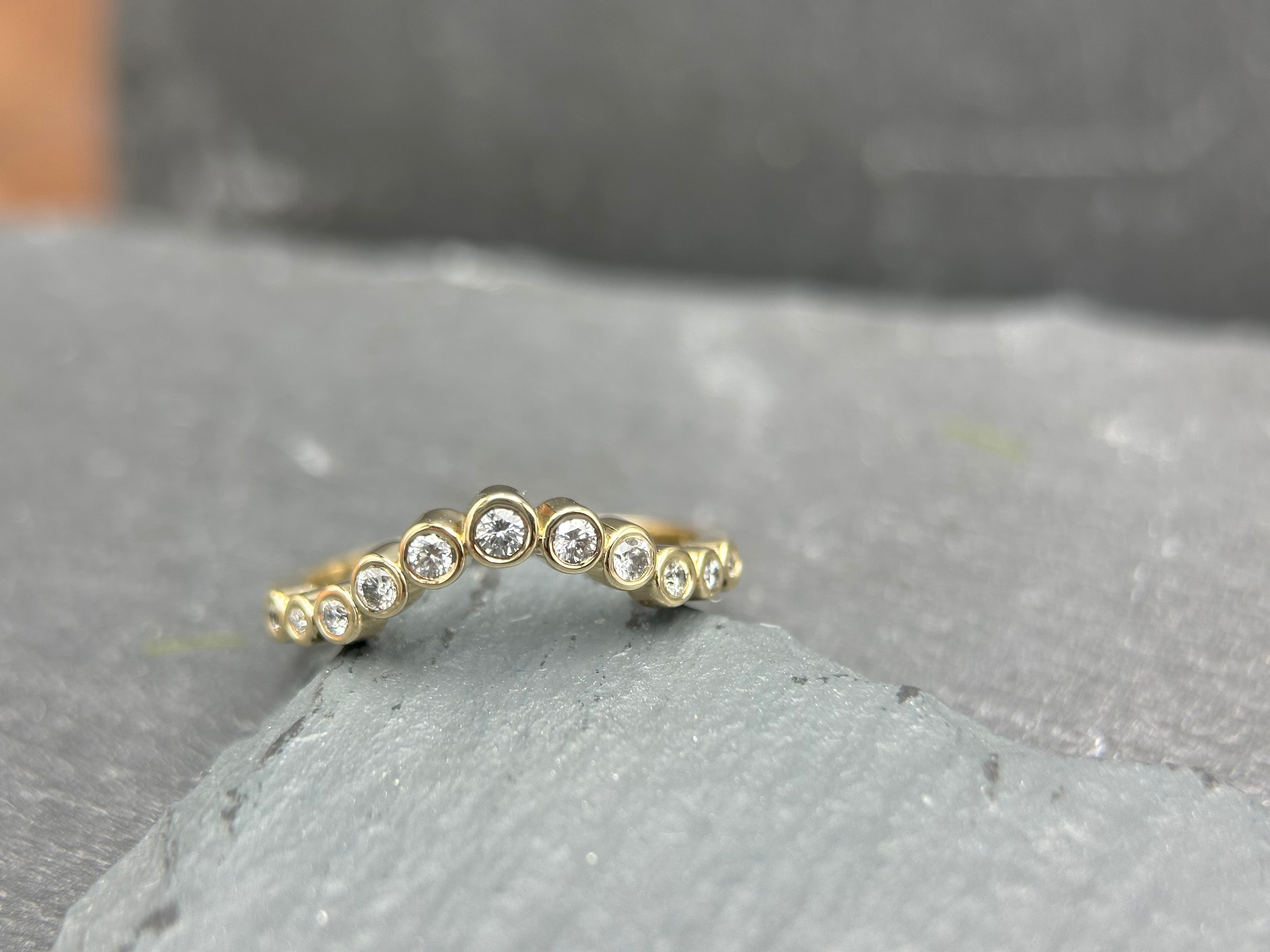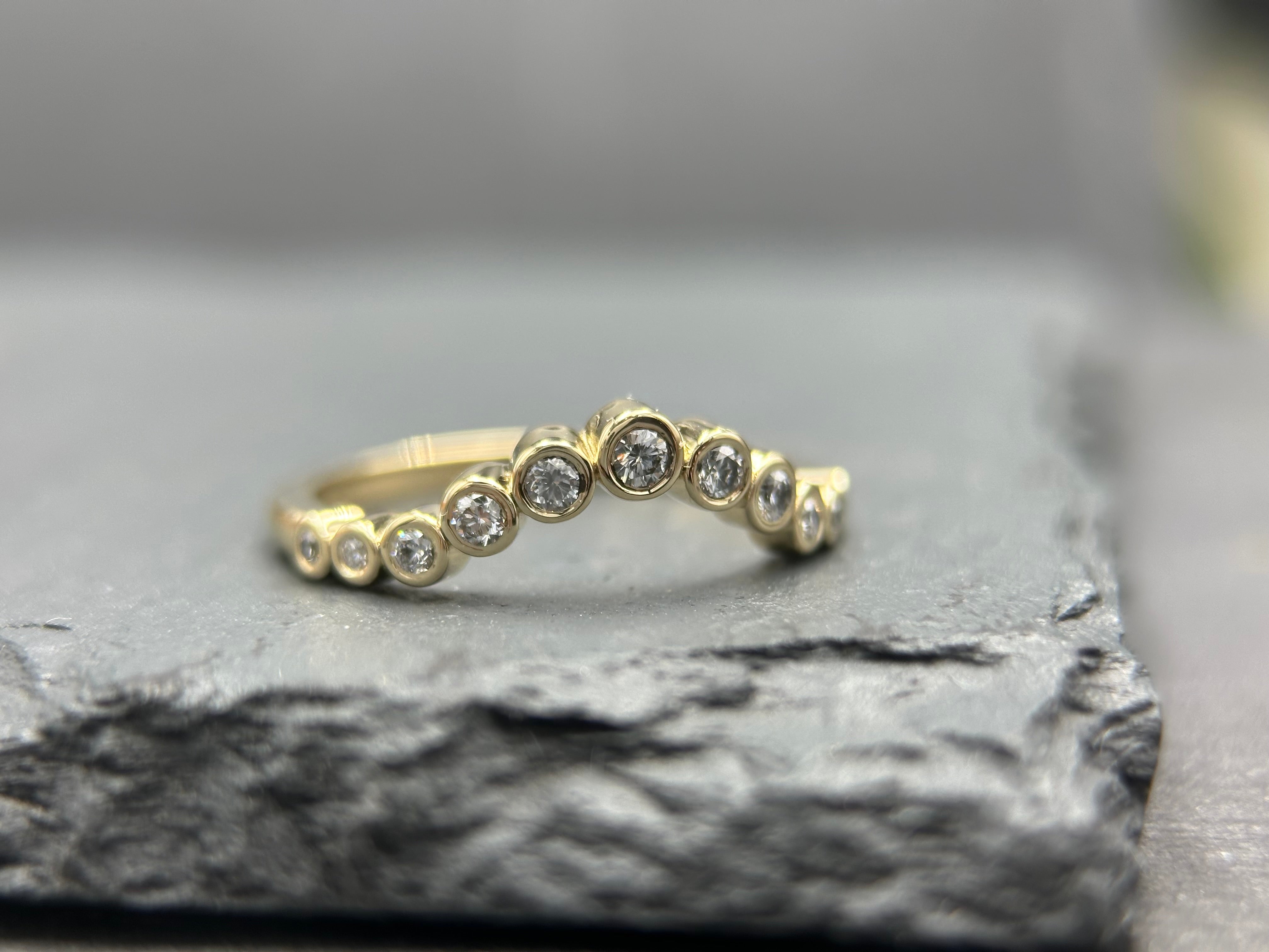 Add sparkle to your stack with this gorgeous bezel contour band! A subtle contour featuring eleven graduating, bezel set lab diamonds, weighing .19ctw. This band is a size 6.5,  is sizable and can be made to order in other metals and sizes.