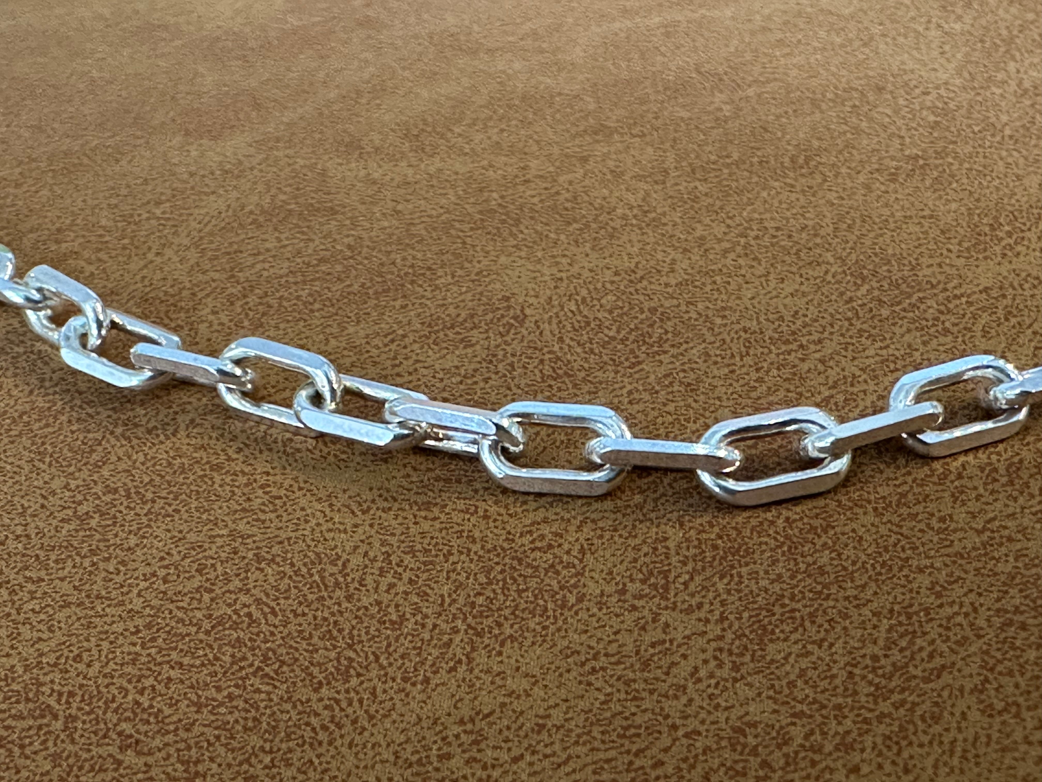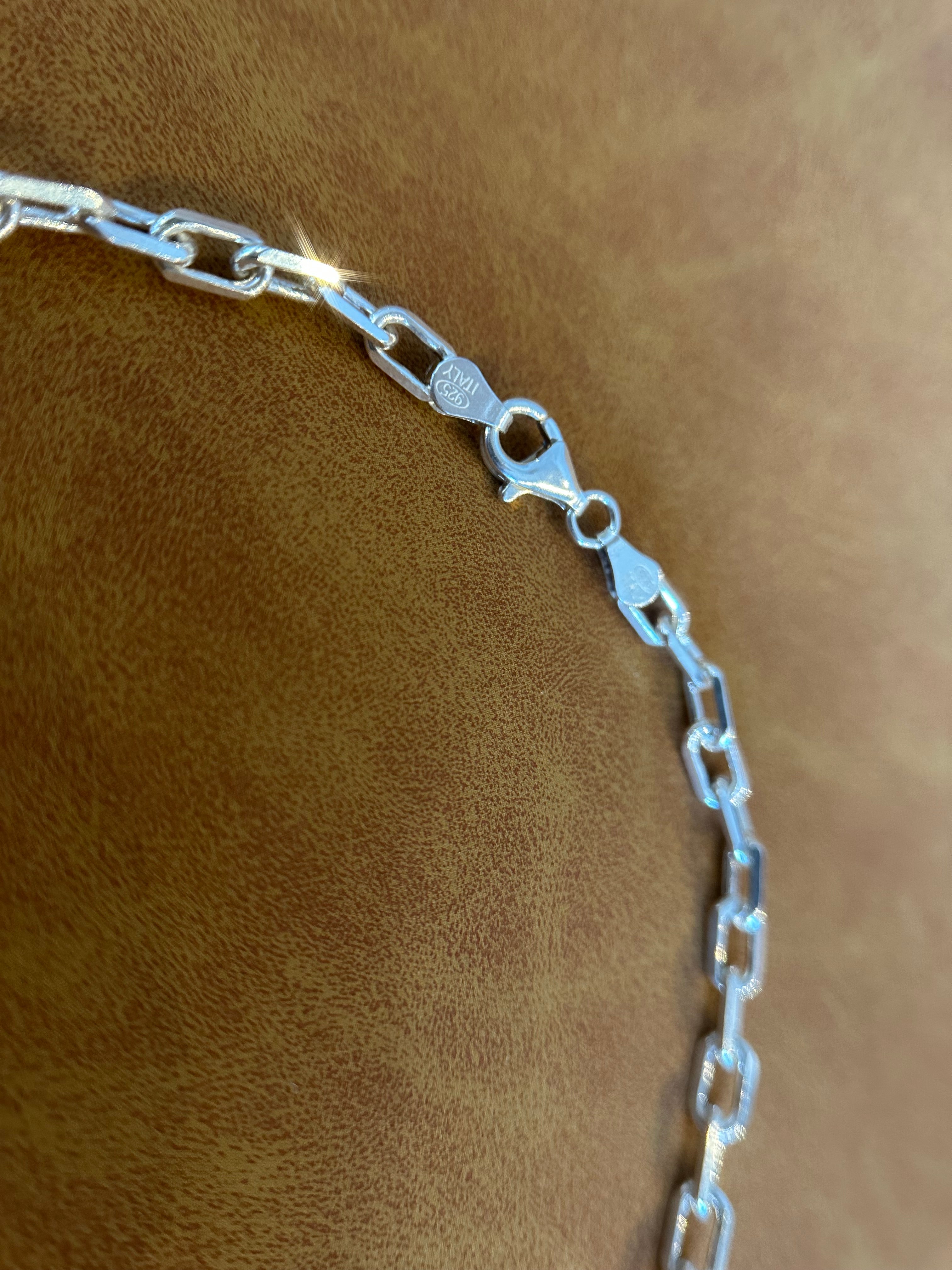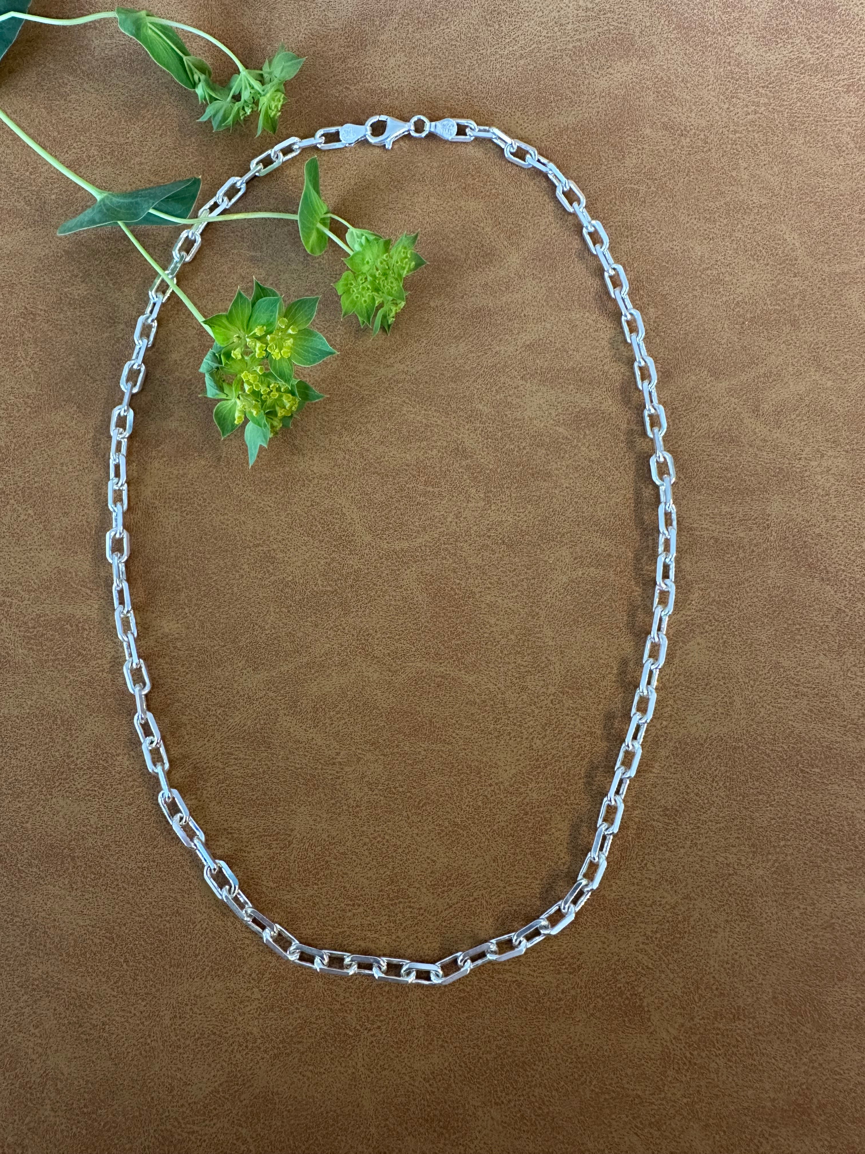 This sterling silver paperclip chain is perfect for layering, or substantial enough to wear on its own. This chain is just shy of 4.5mm in width, and is 18" in length with a sterling silver clasp.