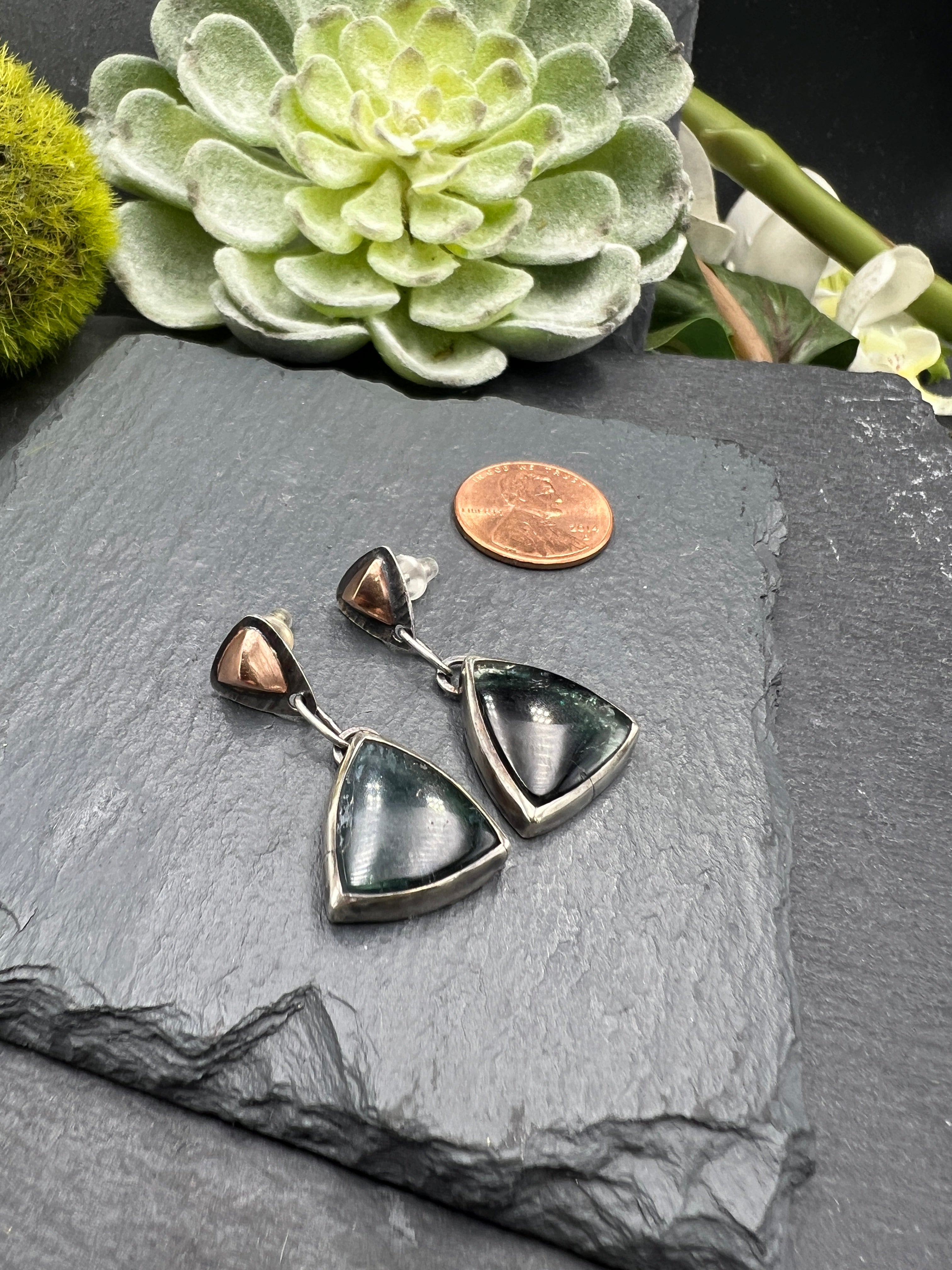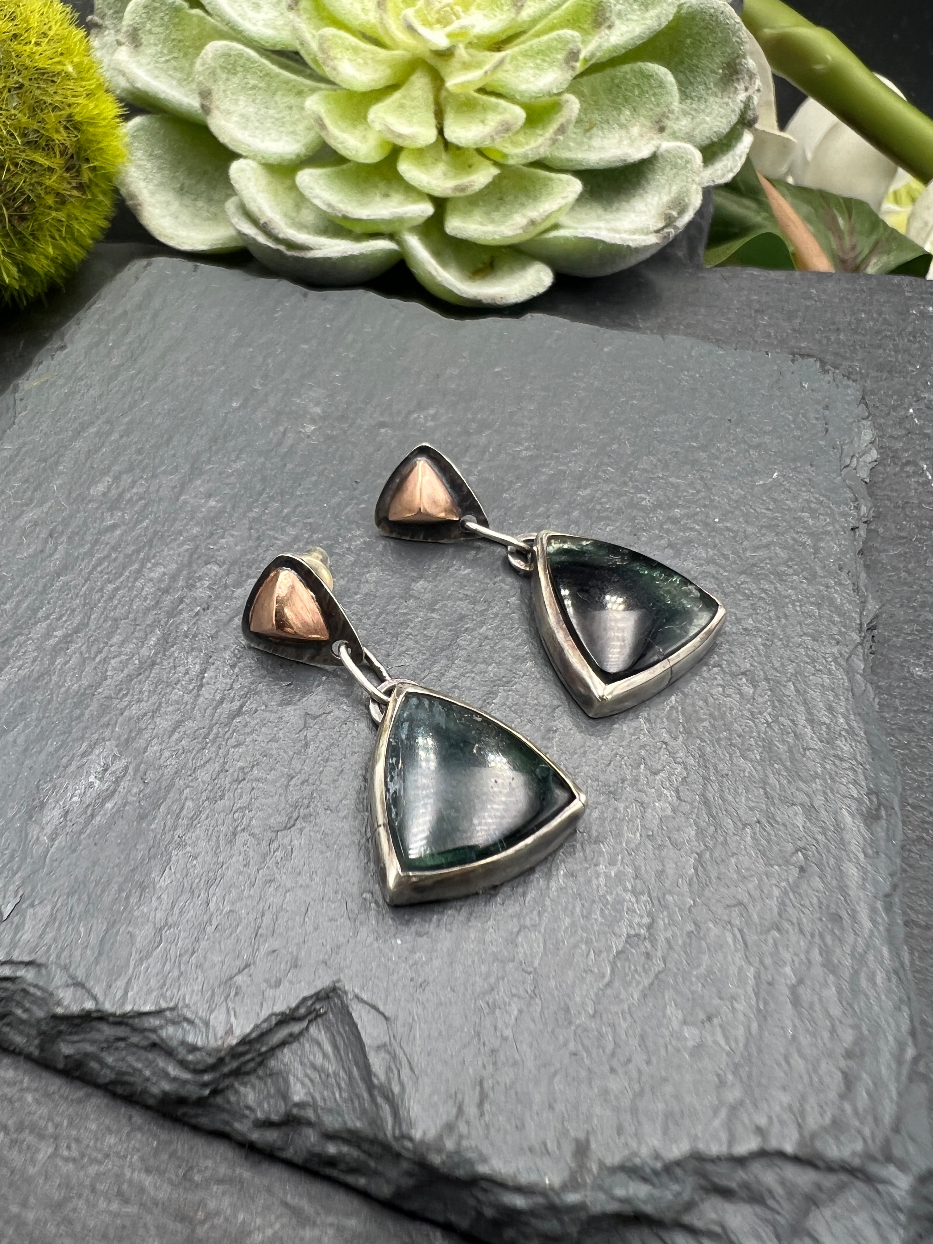 Oxidized sterling silver frames geometrically cut tourmalines linked together to create stunning earrings that feature a triangular rose gold posts. They measure just over 1.5 inches in length.