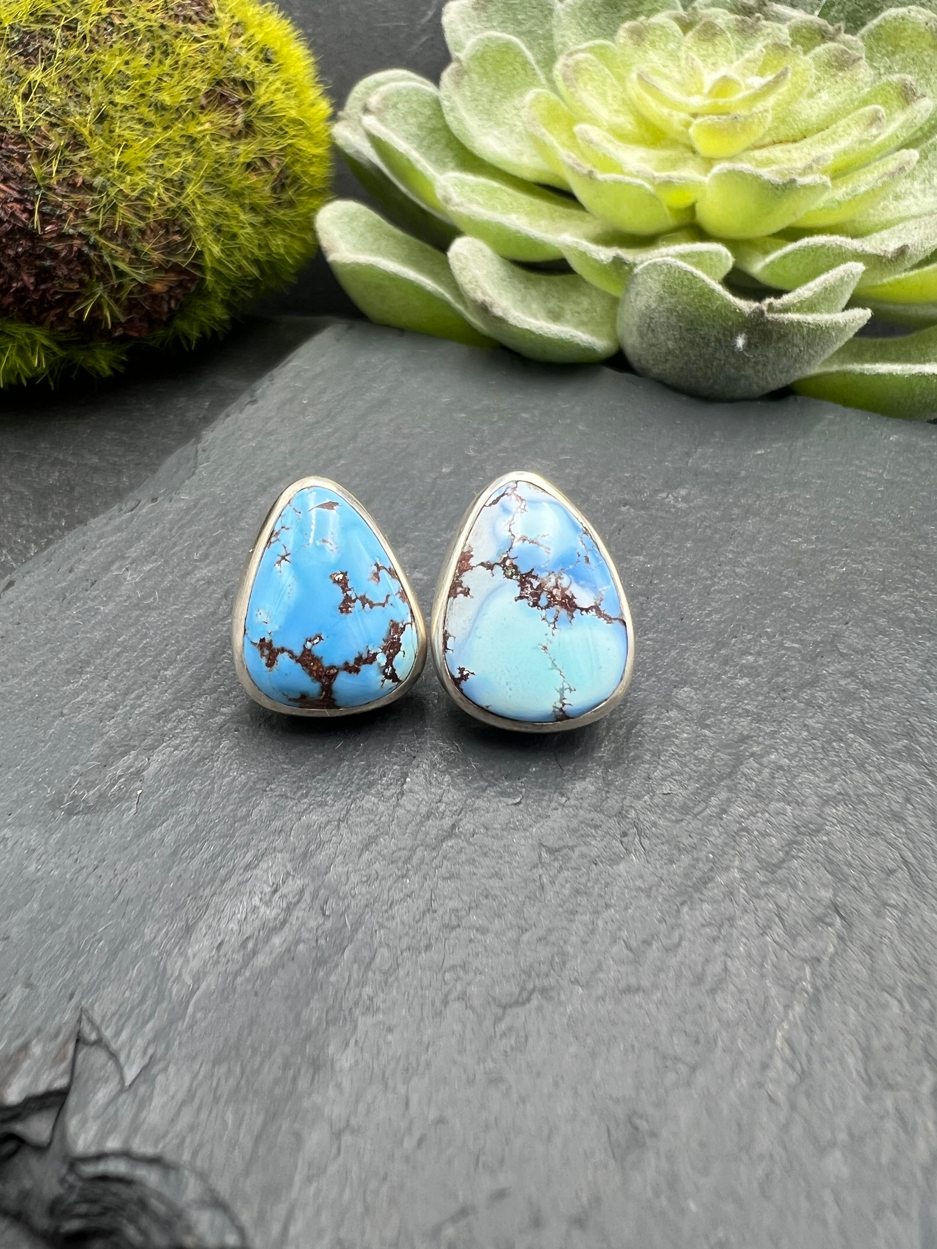 Sterling silver frames Kazakhstan Turquoise triangular stones to create stunning stud earrings. These studs are approximately .75."