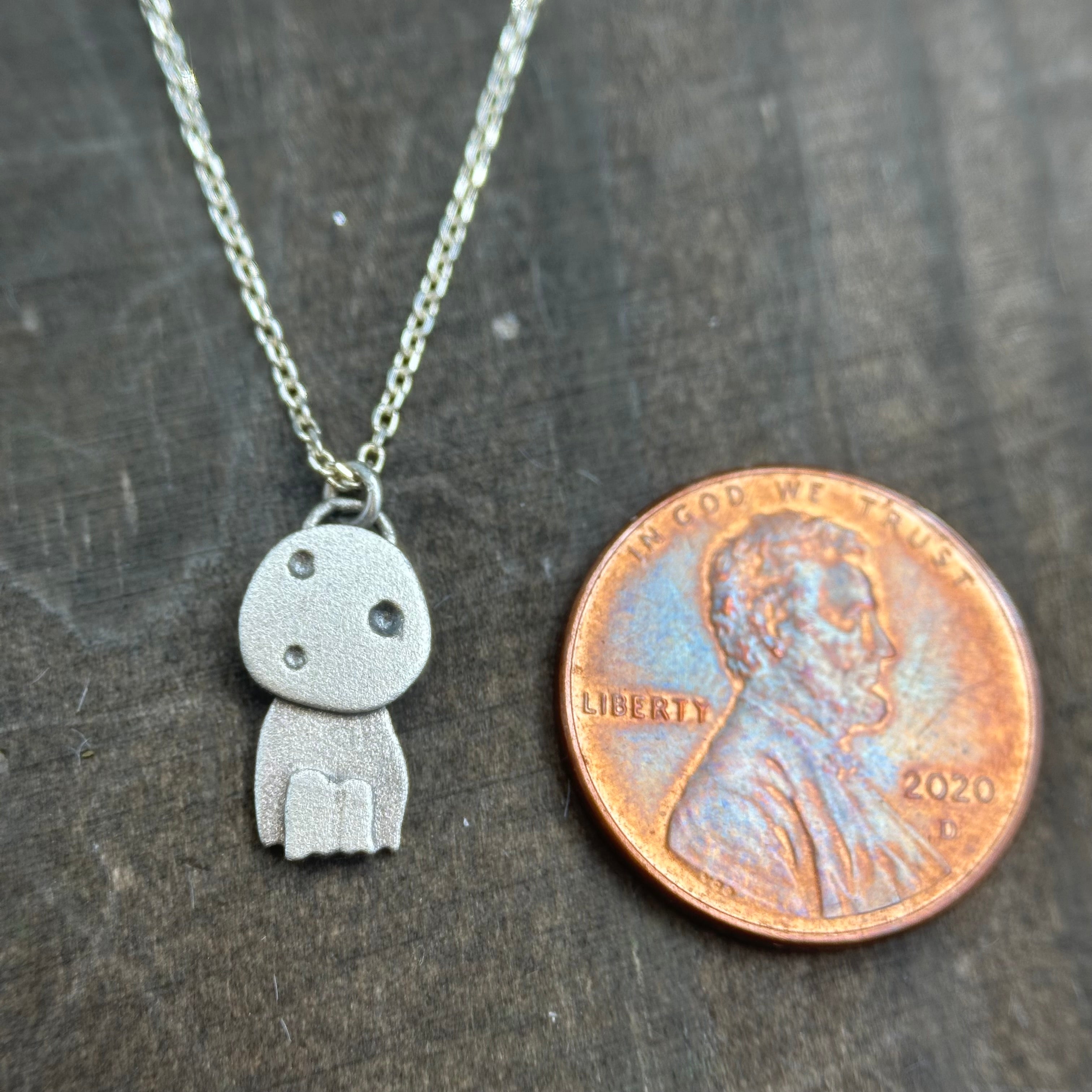 Do you hear the call of the tree spirits? This darling little Kodama pendant is made in sterling silver, and hangs approximately half an inch off of a sterling silver cable chain that has options for 18", 16", and 14" in length.