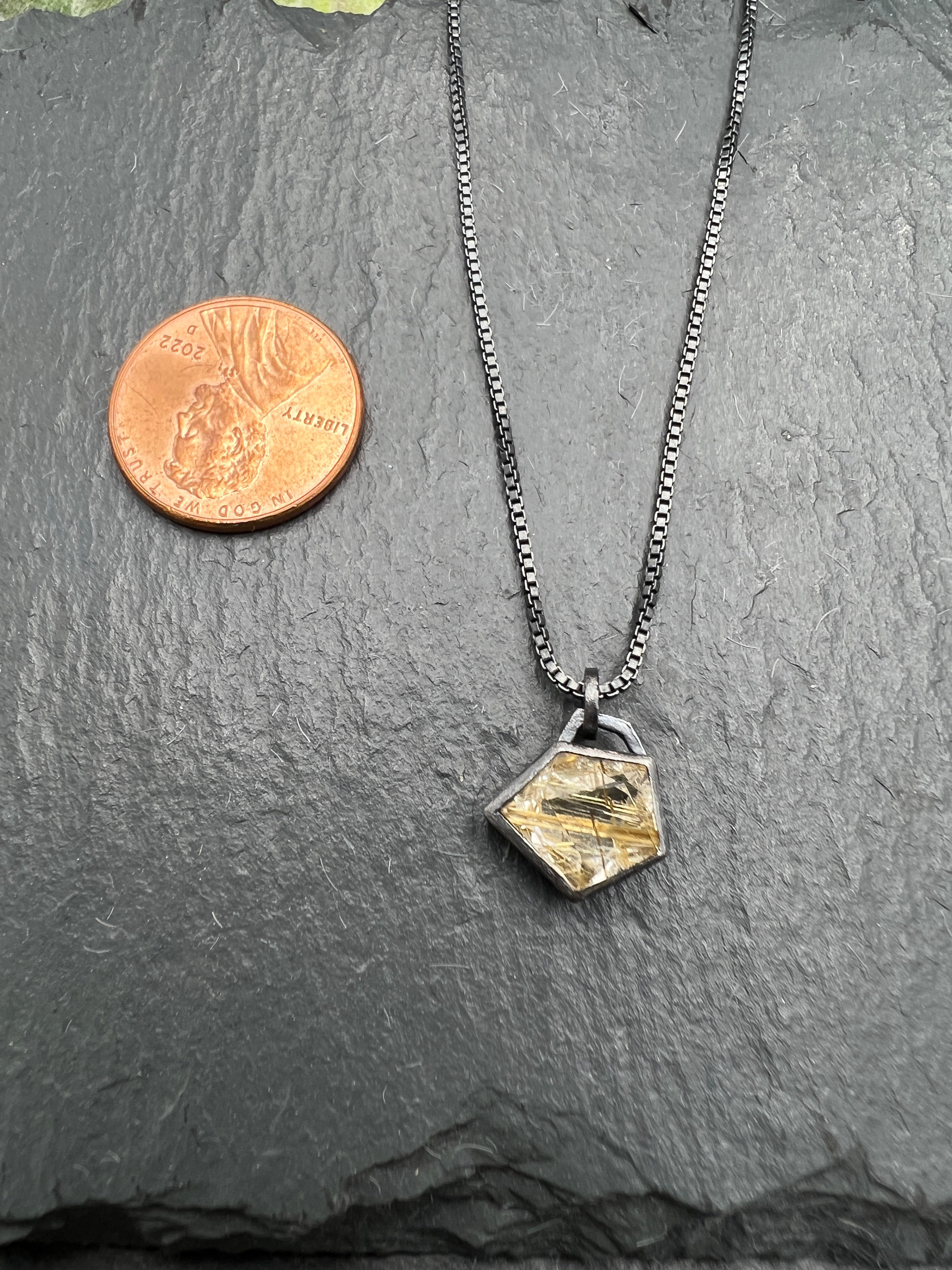 A perfect little necklace, this rutilated quartz is encased in an oxidized silver bezel, highlighting the unique geometric shape. The pendant hangs approximately half an inch from the 18" oxidized box chain.