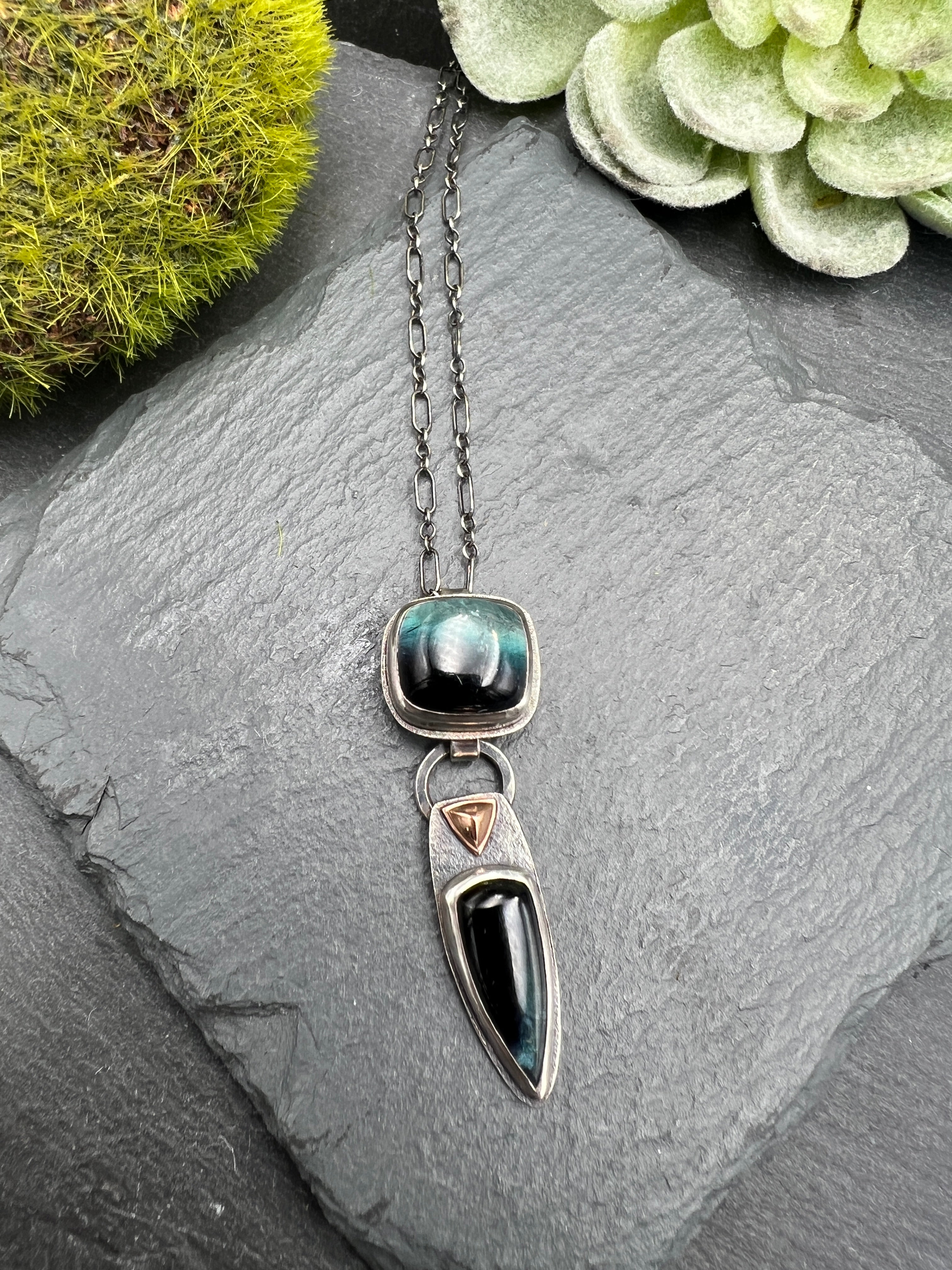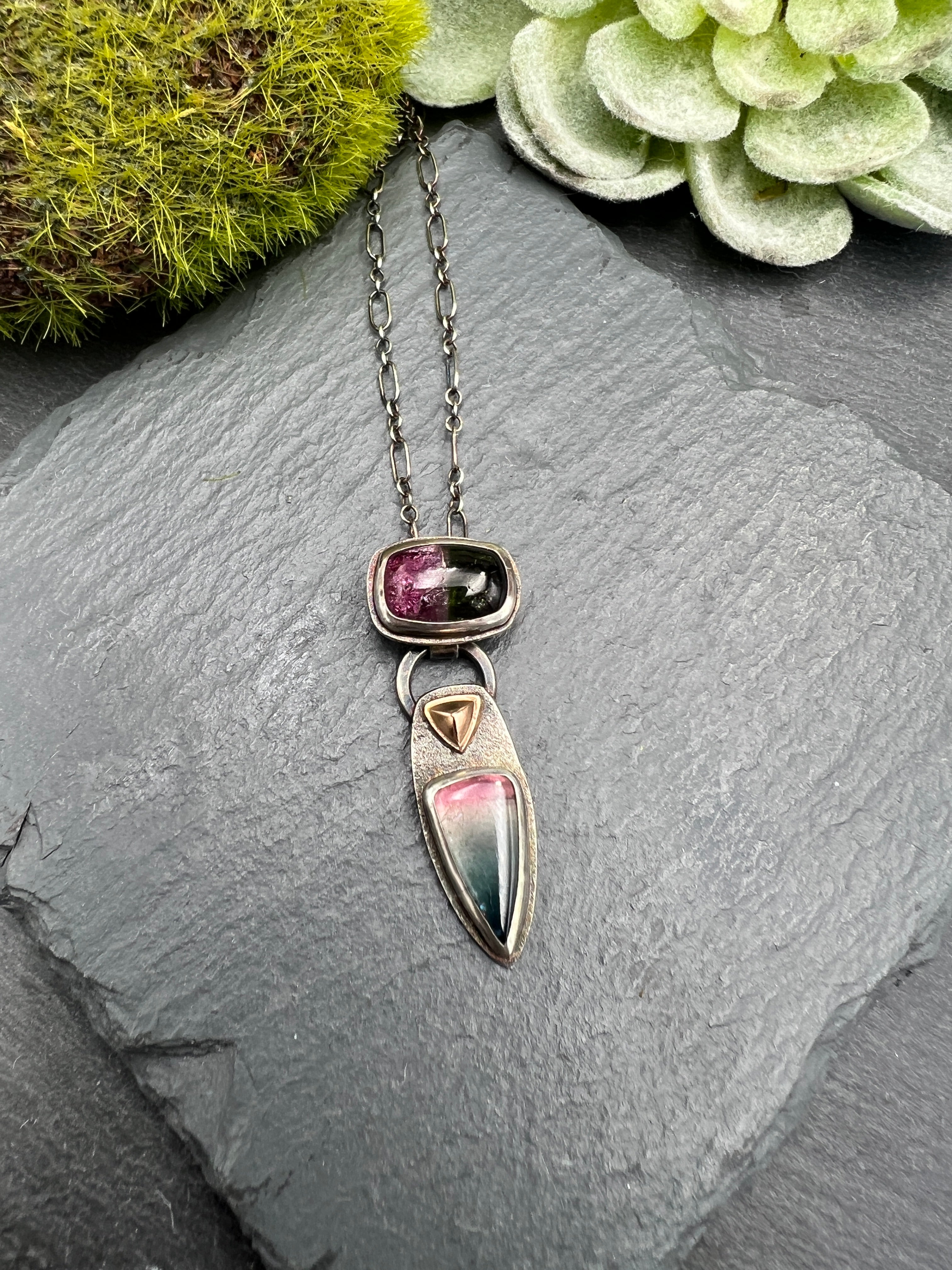 These necklaces feature tourmaline in different shades, set in oxidized sterling silver with a triangular rose gold accent. The green tourmaline pendant measures 2" in length and sits on a 20" oxidized silver chain, and the purple/pink tourmaline pendant measures 1.5" in length and sits on a 17" oxidized chain.