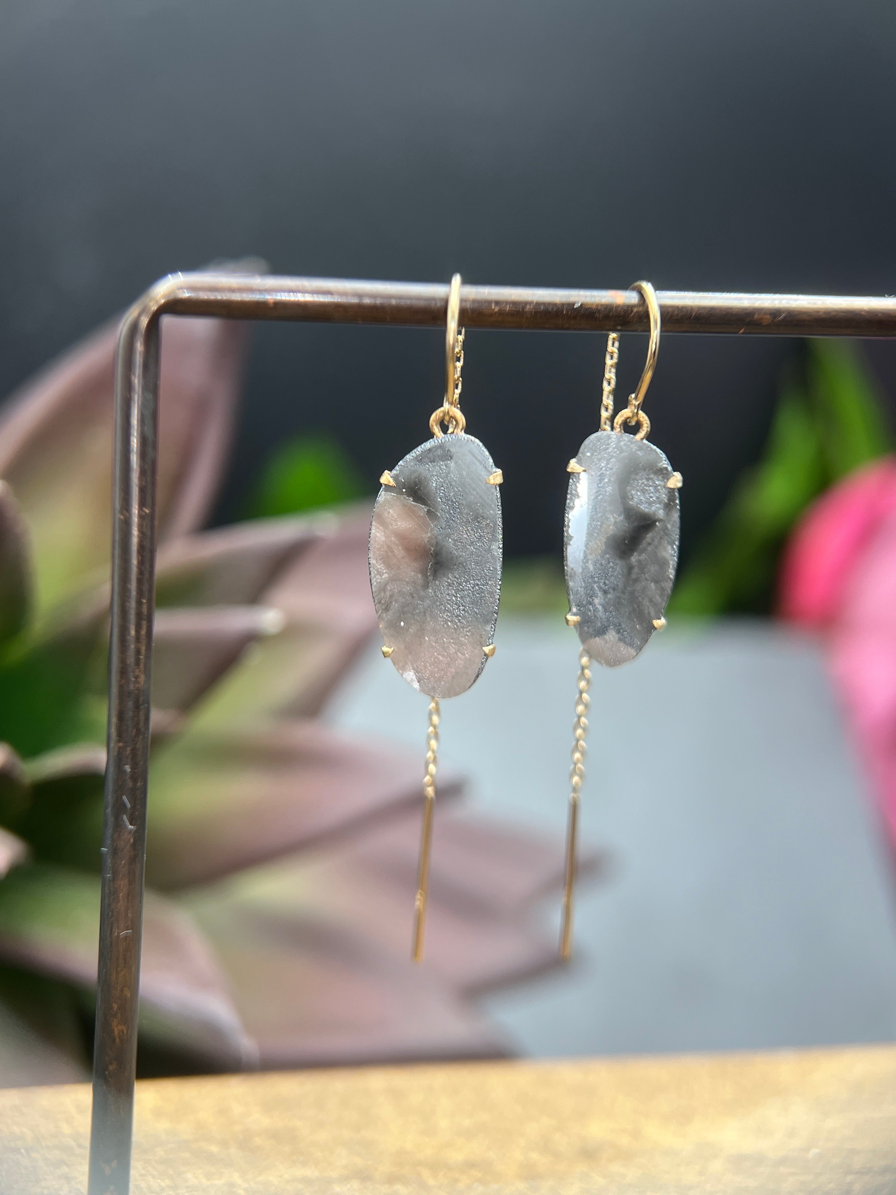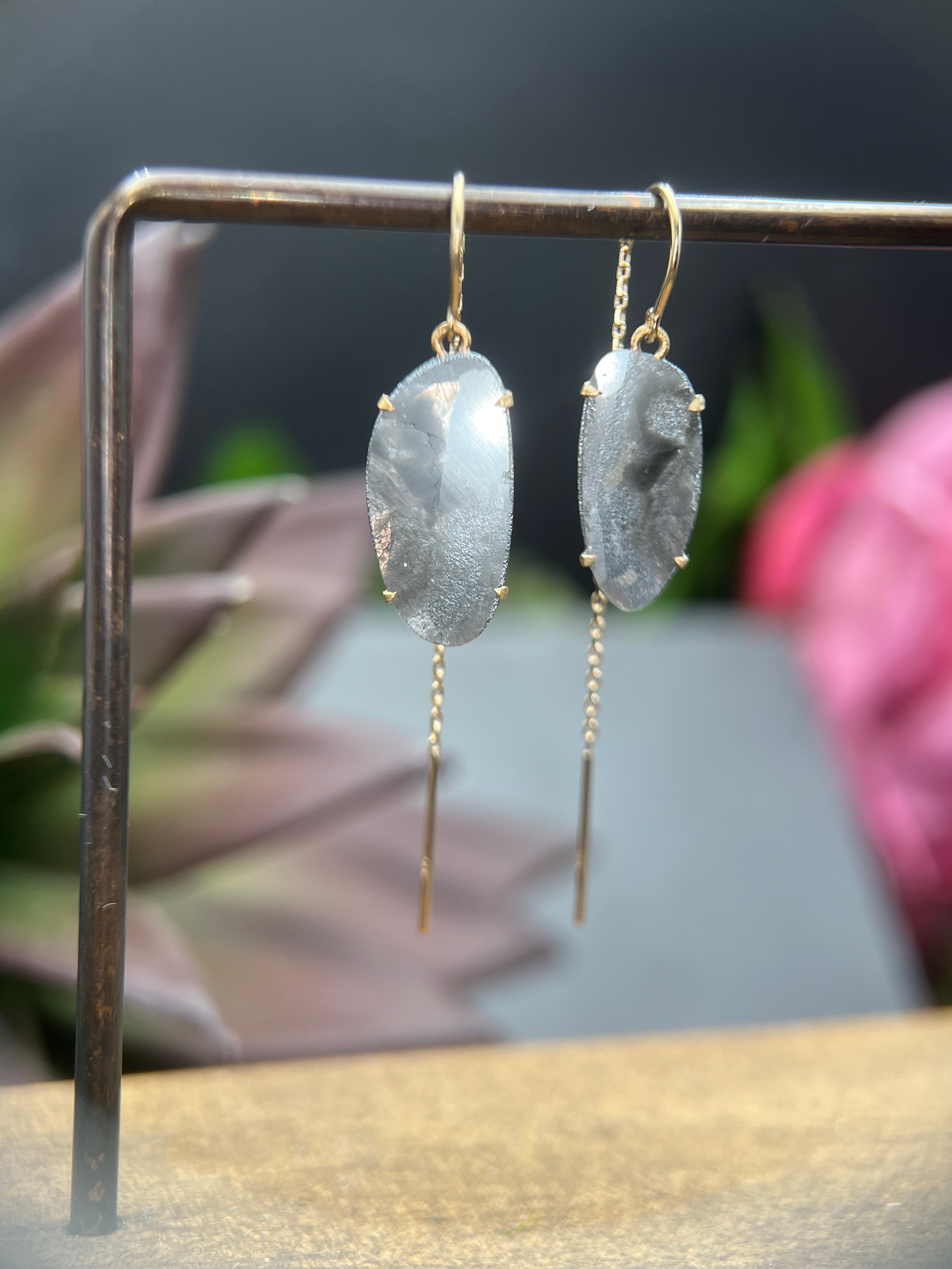 These beautifully delicate threader earrings feature mismatched rustic diamond slices (2.23ctw) held on a plate of oxidized silver by 14k yellow gold talon prongs, connected to 14k yellow gold chain threaders. The earring measure 2 inches in length.