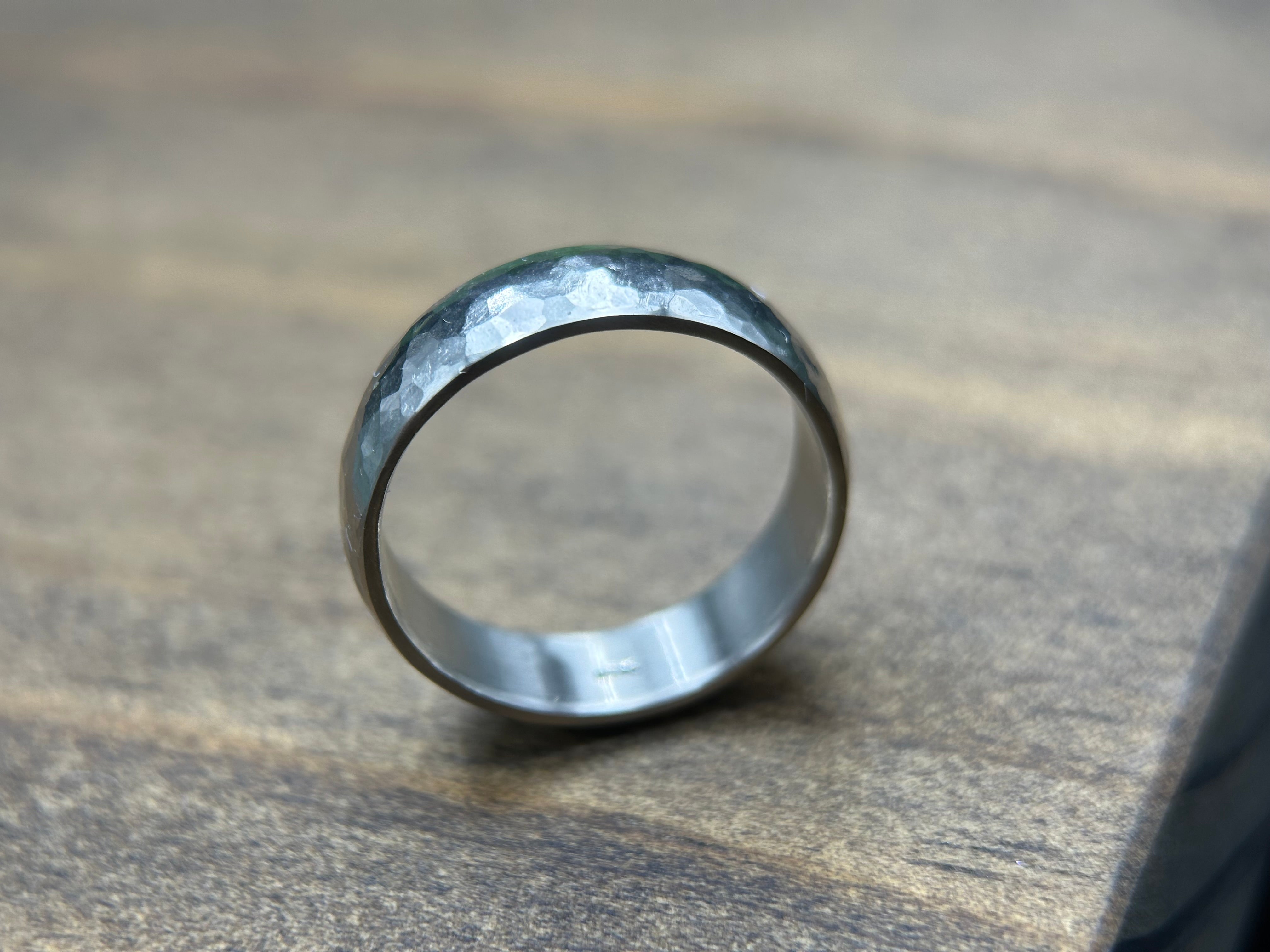This ring was made by a in-house jeweler at Balefire Goods. This 14k palladium white gold features a slightly shiny pin finish to bring out the hammered textures of this band.