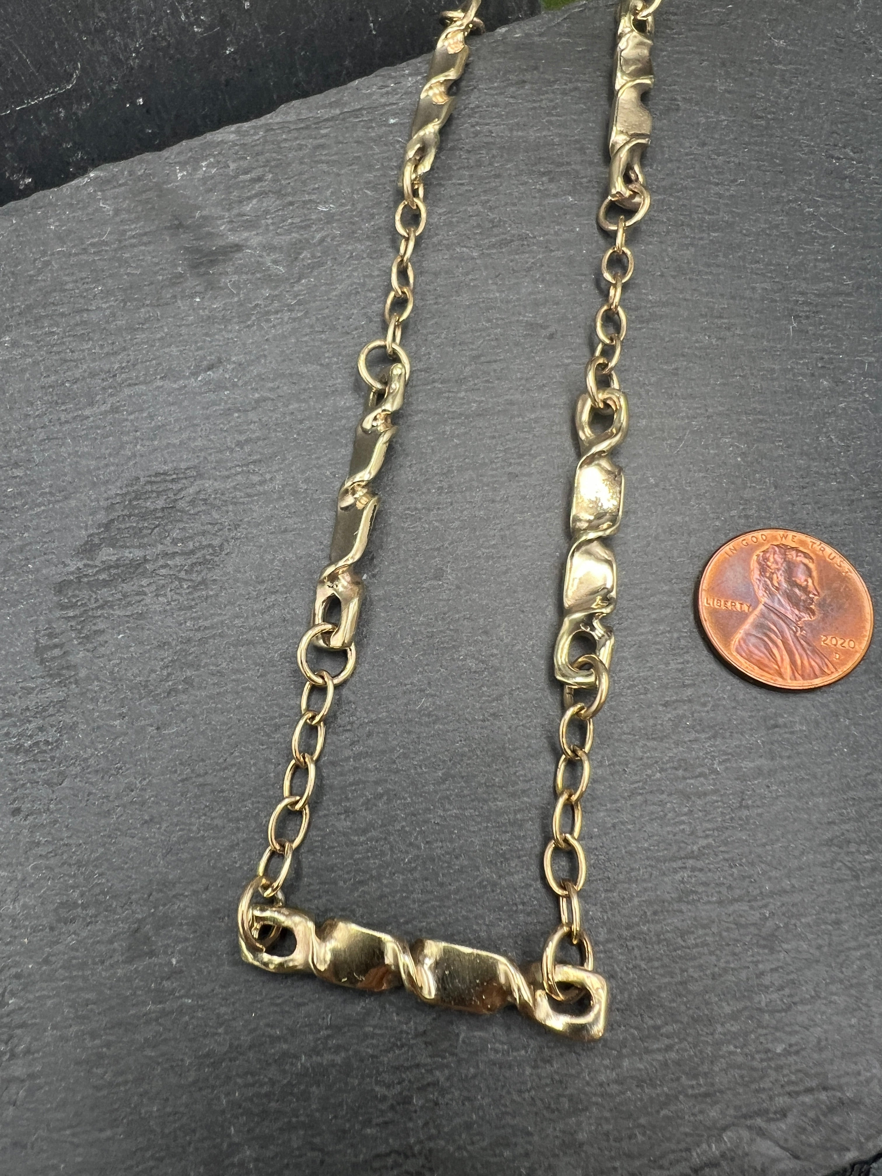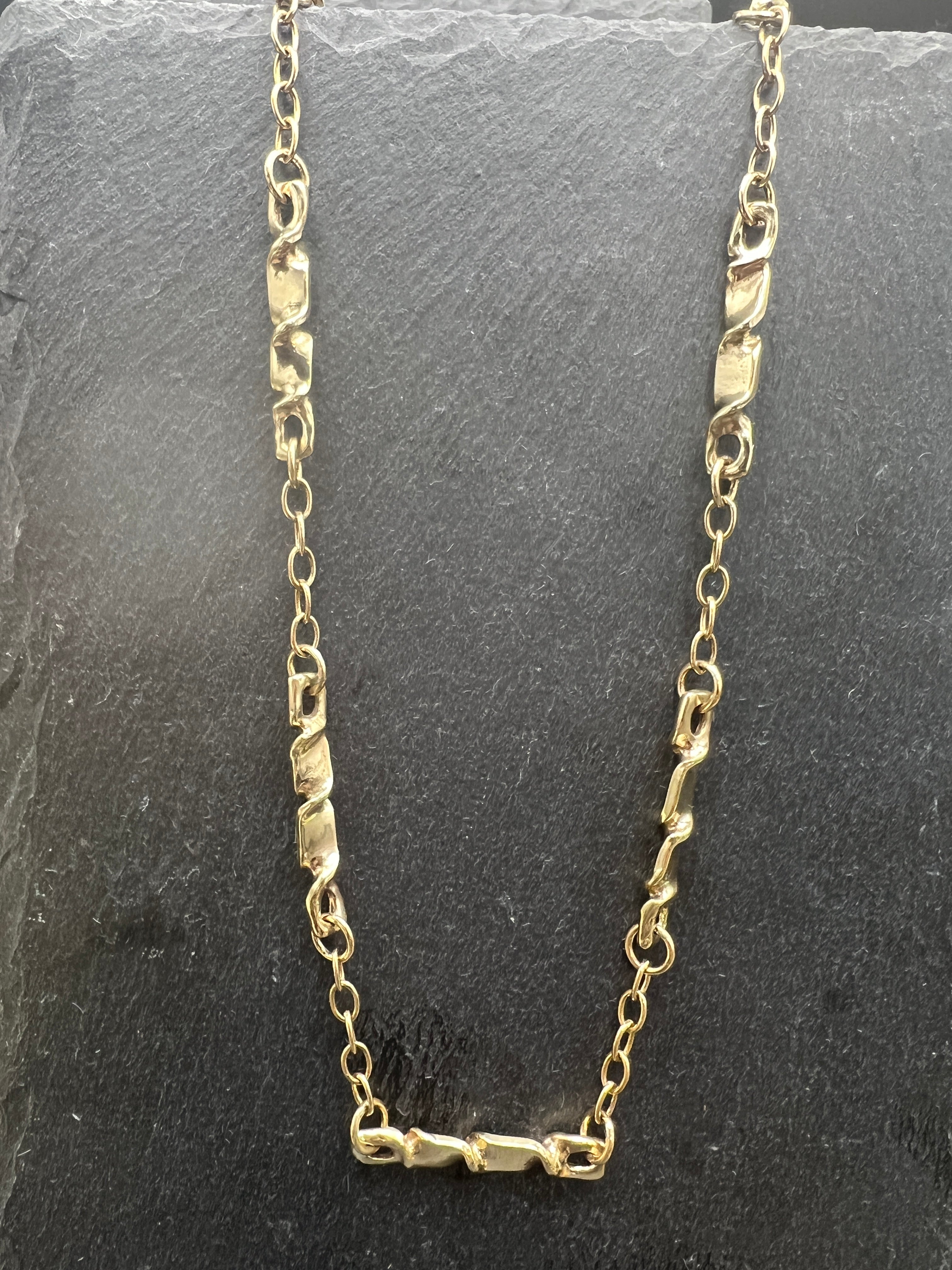 This unique brass chain features links broken up by unique brass twists to create visual interest along the necklace. This chain measures 25" long, but can be adjusted to a variety of lengths.