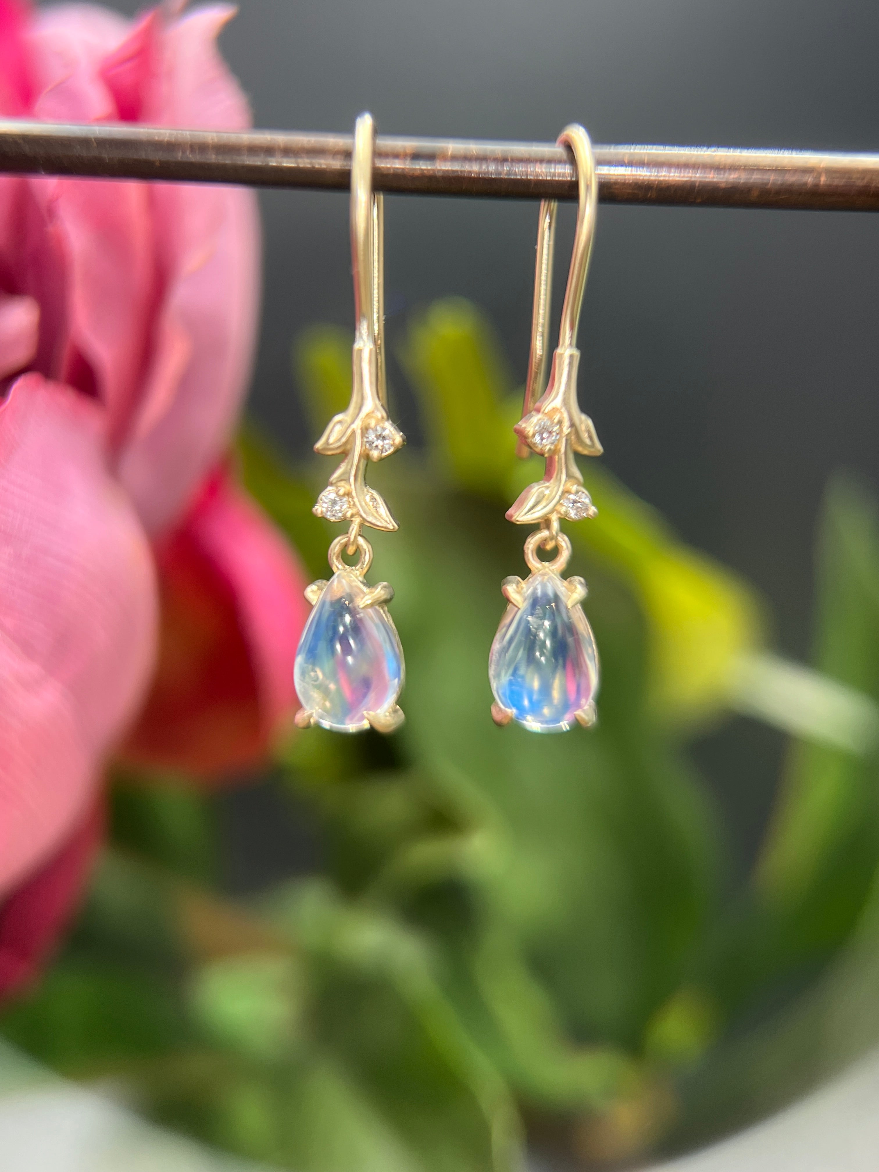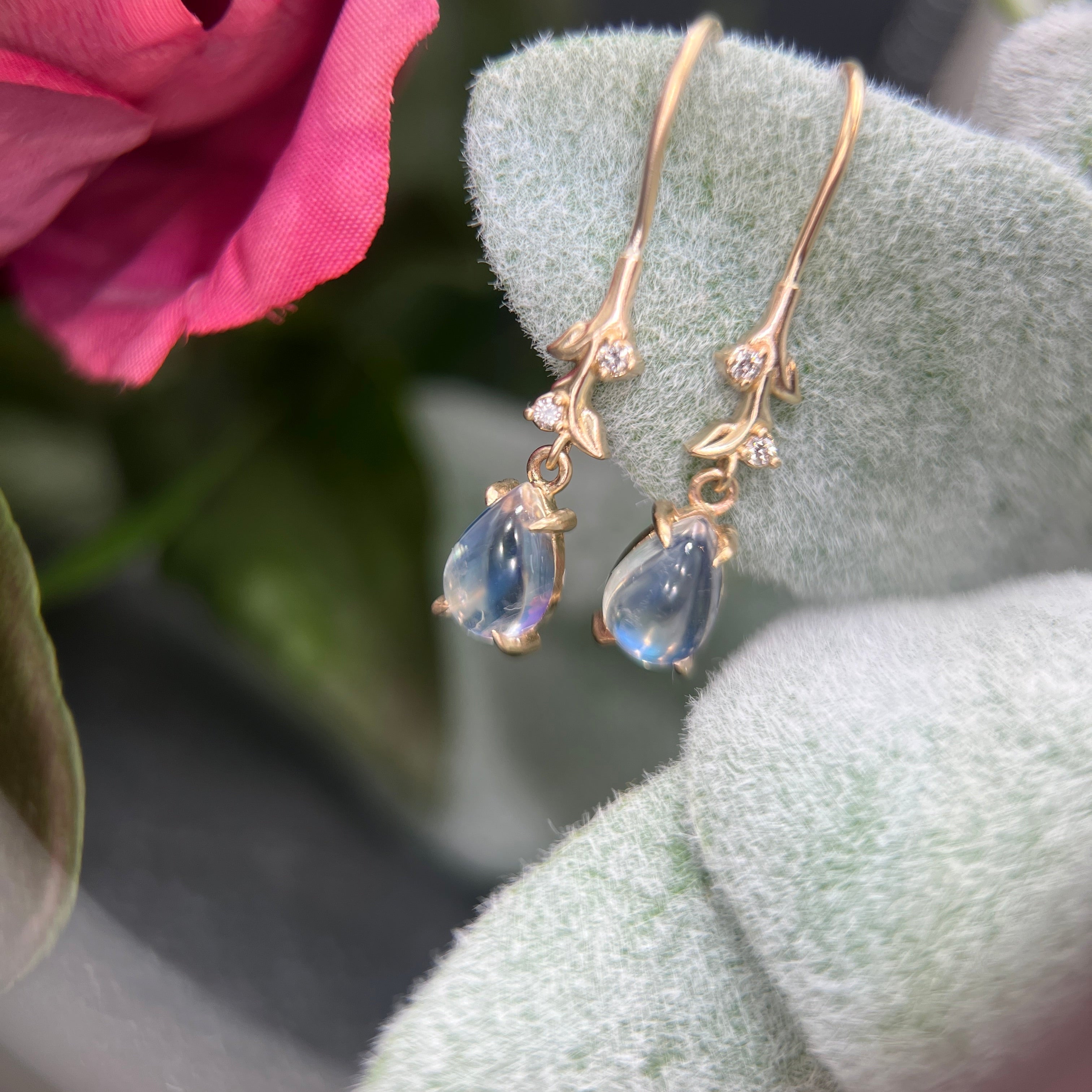 Ethereal in nature, these beautiful earrings are made in 14k yellow gold, with floral and diamond accents, ending in tear drop moonstones. The lab diamonds are .04ctw, and the moonstones weigh 2.39ctw. These earrings measure 1.25" long and are one-of-a-kind.