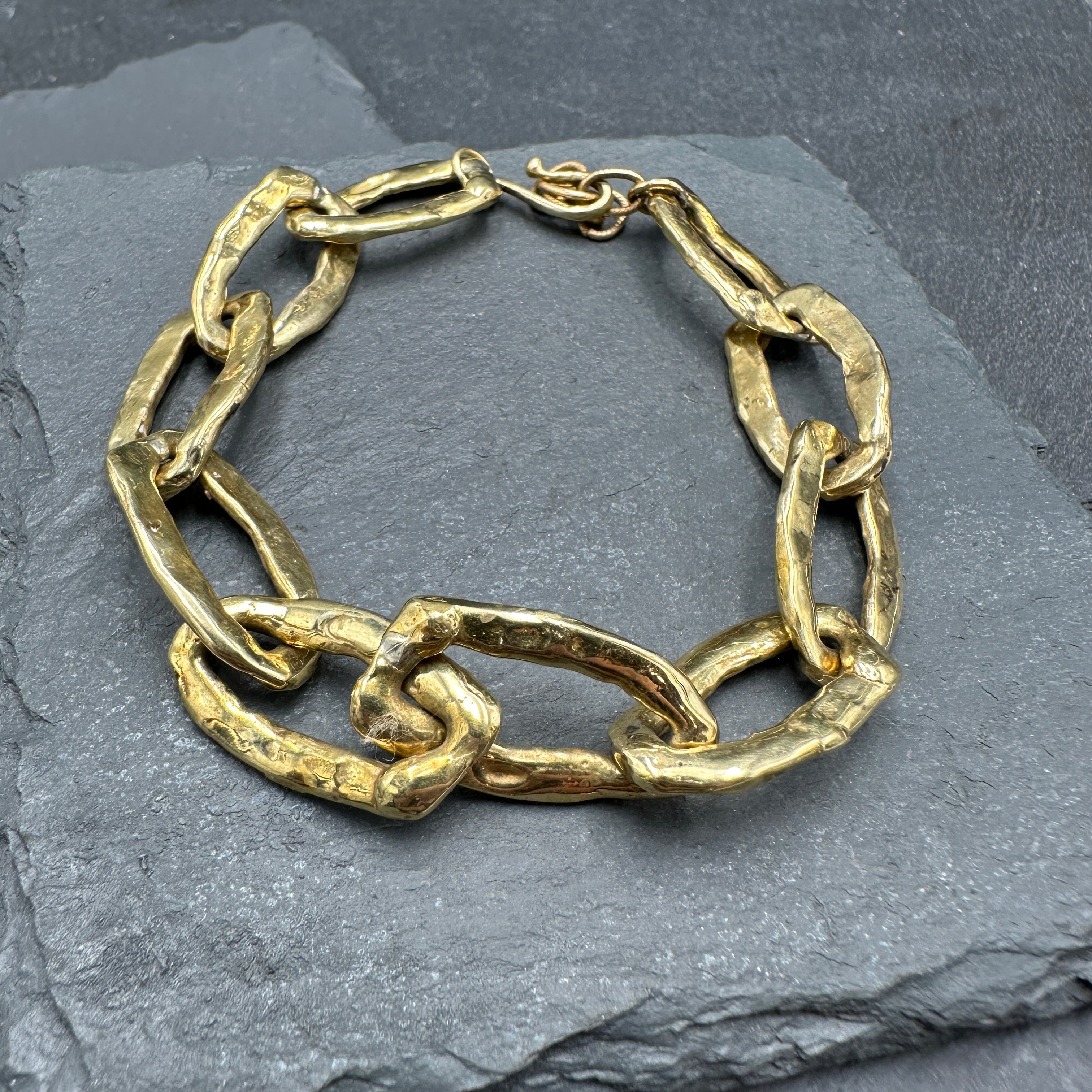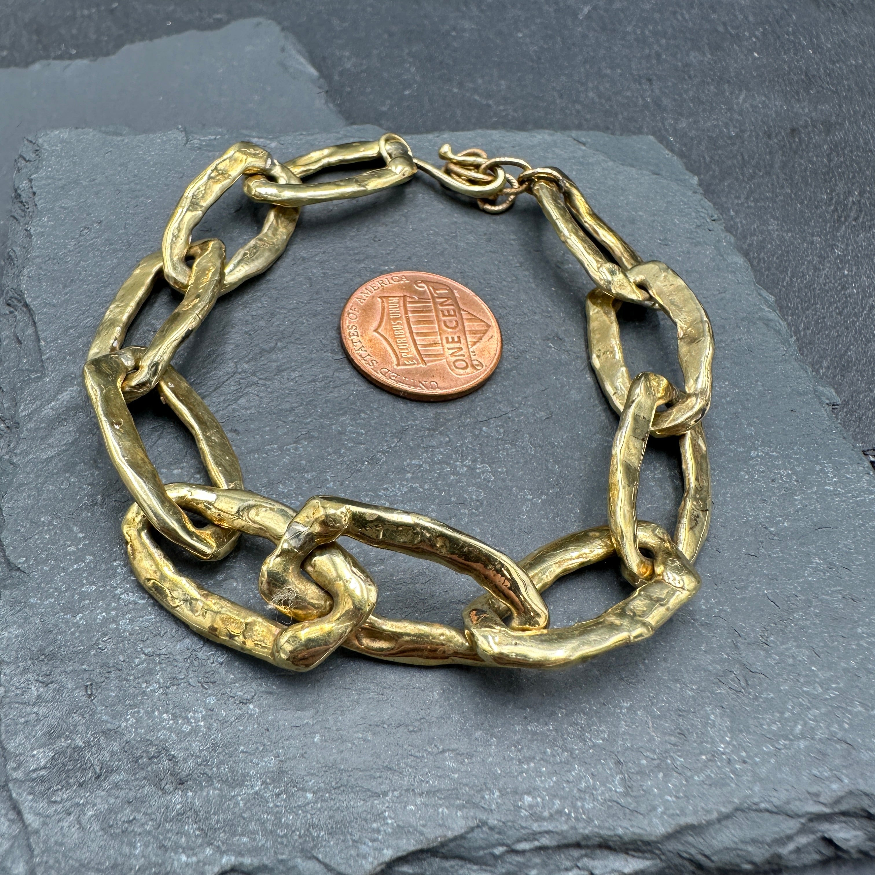 Heavy organically shaped brass links from raw brass or in sterling silver connect to create a bold bracelet adjustable between 8 1/2 and 9 inches.