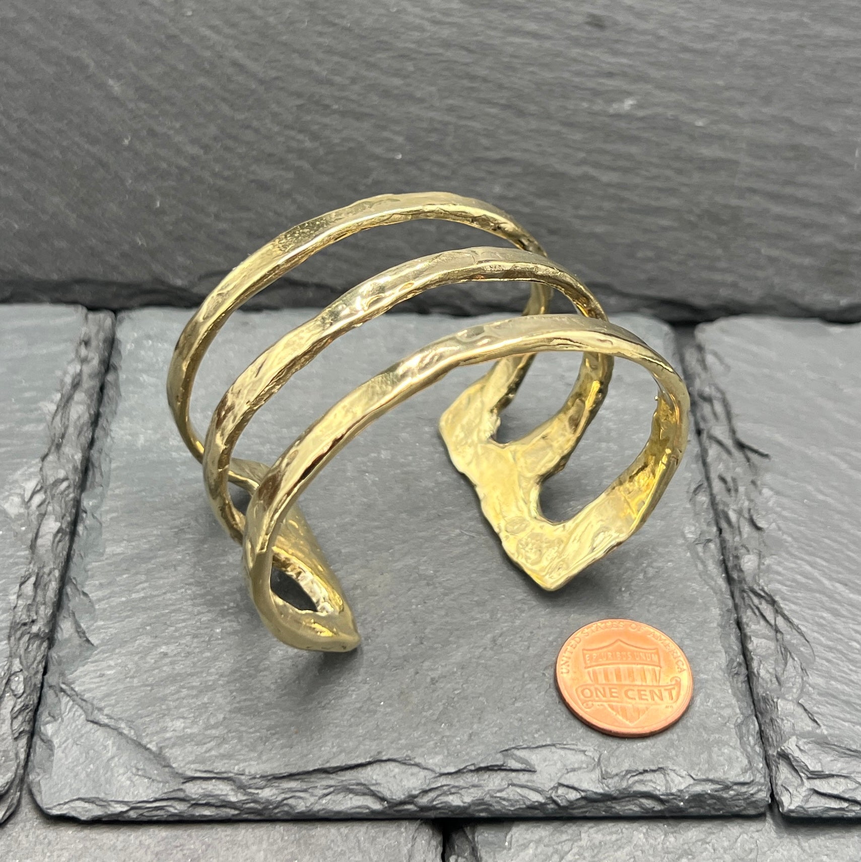 An brass cuff with an organic high polish surface. Perfect for everyday wear or to dress up for a night out. Approximately 1.5 inches wide and 2.5 inches across.