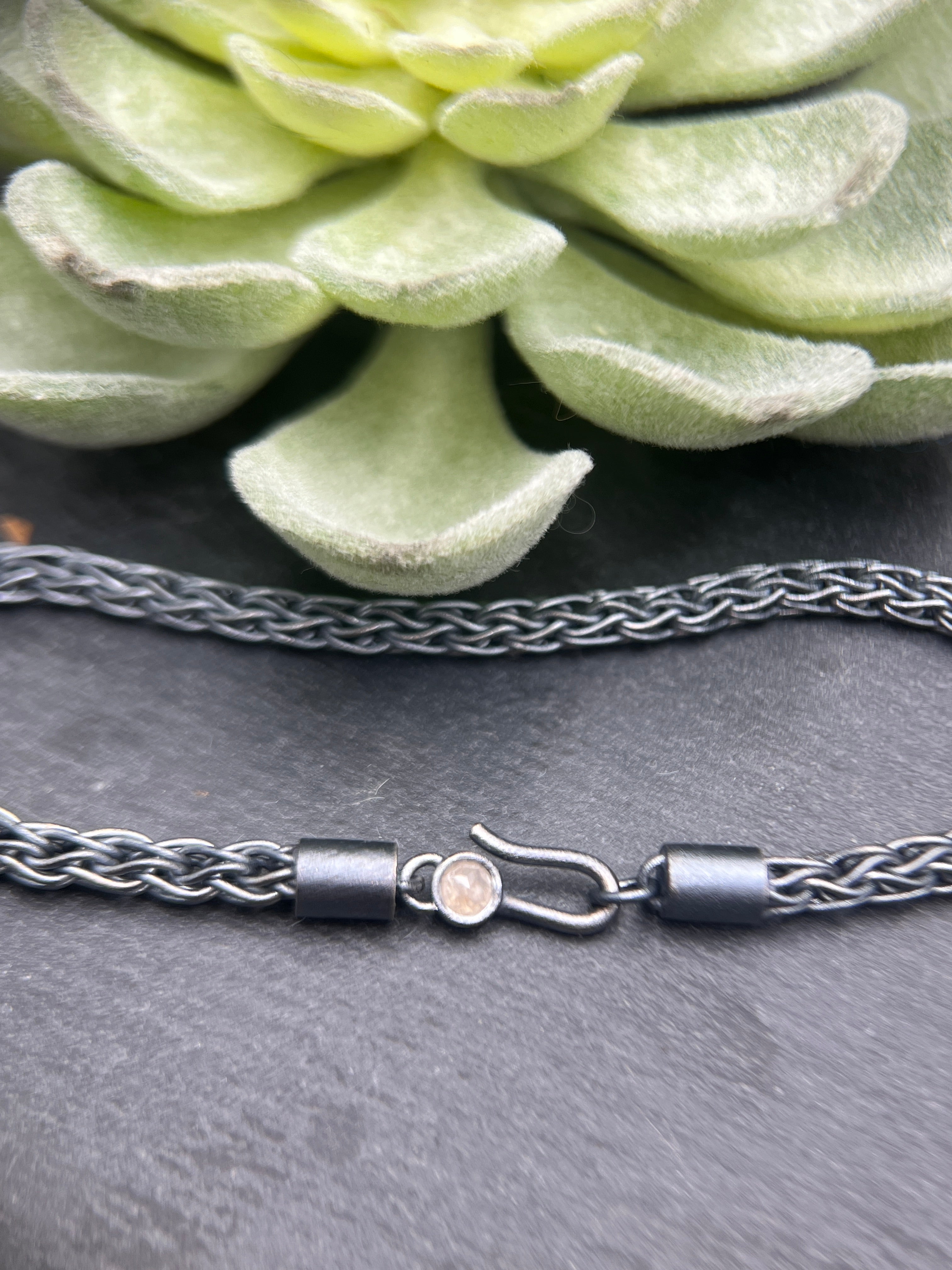 This oxidized fine silver and sterling silver bracelet is completely handmade including each individual jump ring that makes up the woven links. It has a sandblasted finish with a custom, geometric hook clasp featuring a .14ct opalescent rose cut diamond. This bracelet measures 7.5" long.