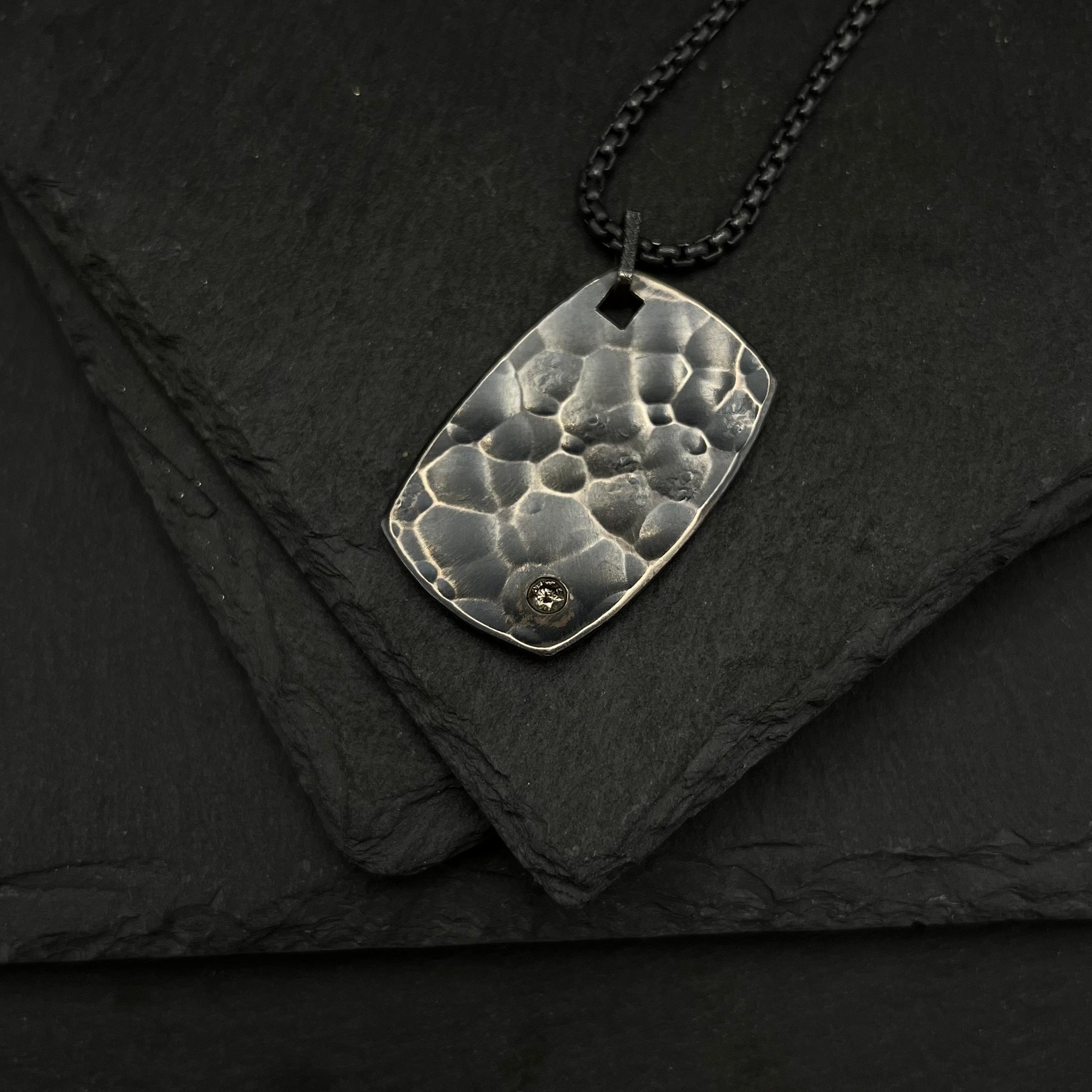This necklace features a 3mm champagne colored .10 carat diamond. The stone sparkles beautifully against the oxidized sterling silver. A hand wrought bail attaches it to a substantial oxidized sterling silver rounded box chain.