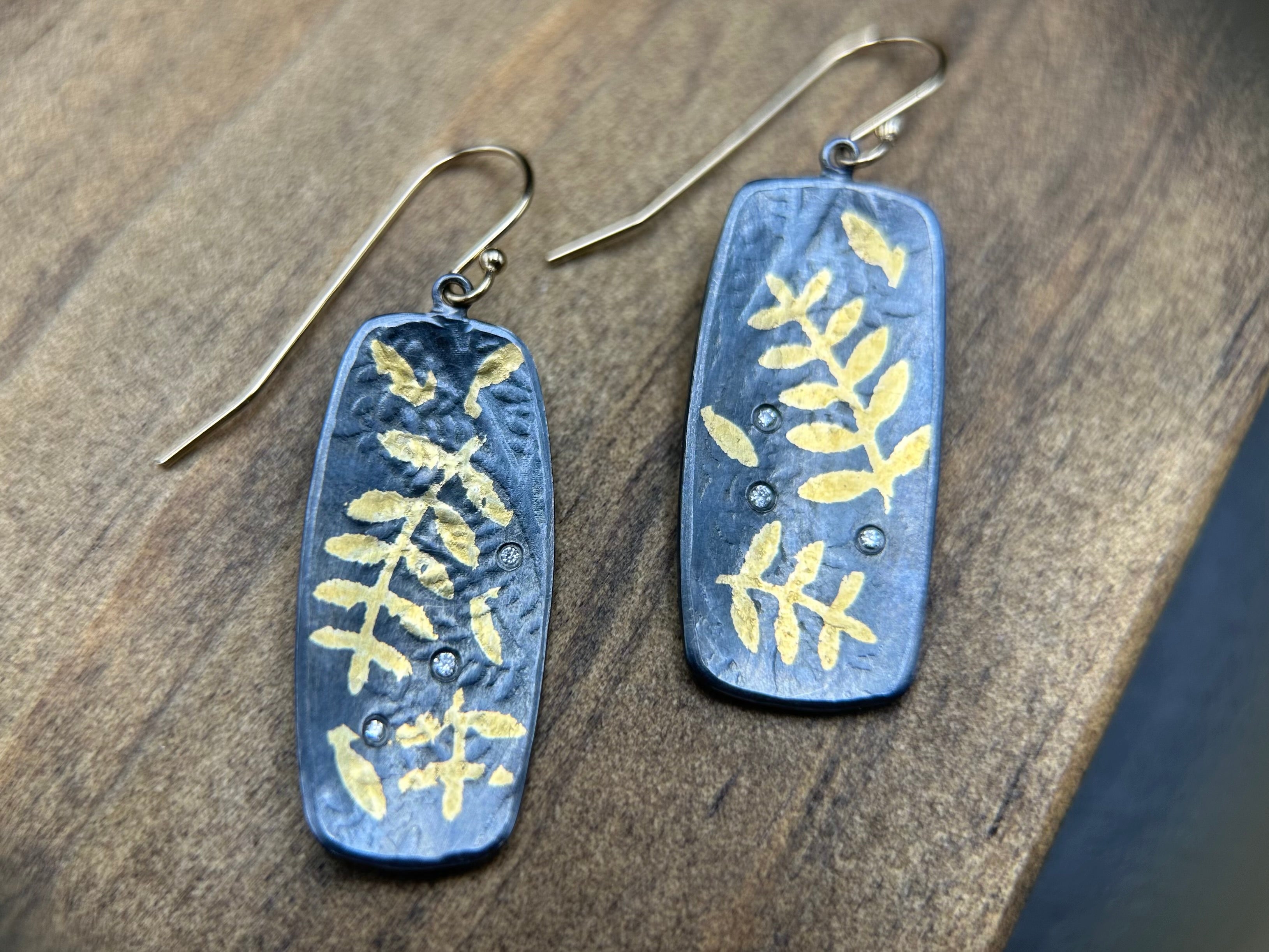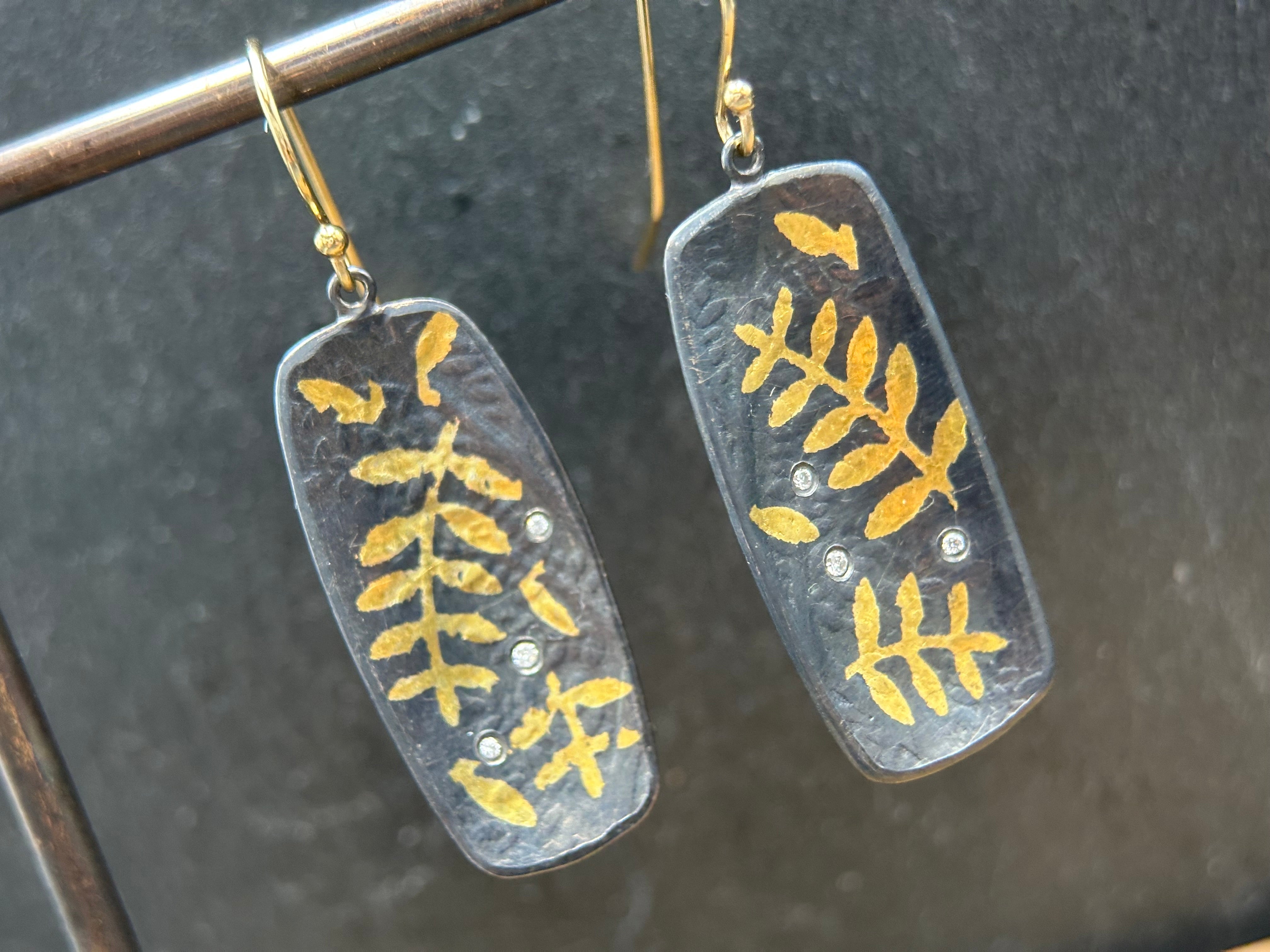 These rounded, rectangular-shaped dangle earrings are made of oxidized sterling silver with 24k yellow gold keum boo leaf motifs fused onto them, featuring three small diamonds on each earring.