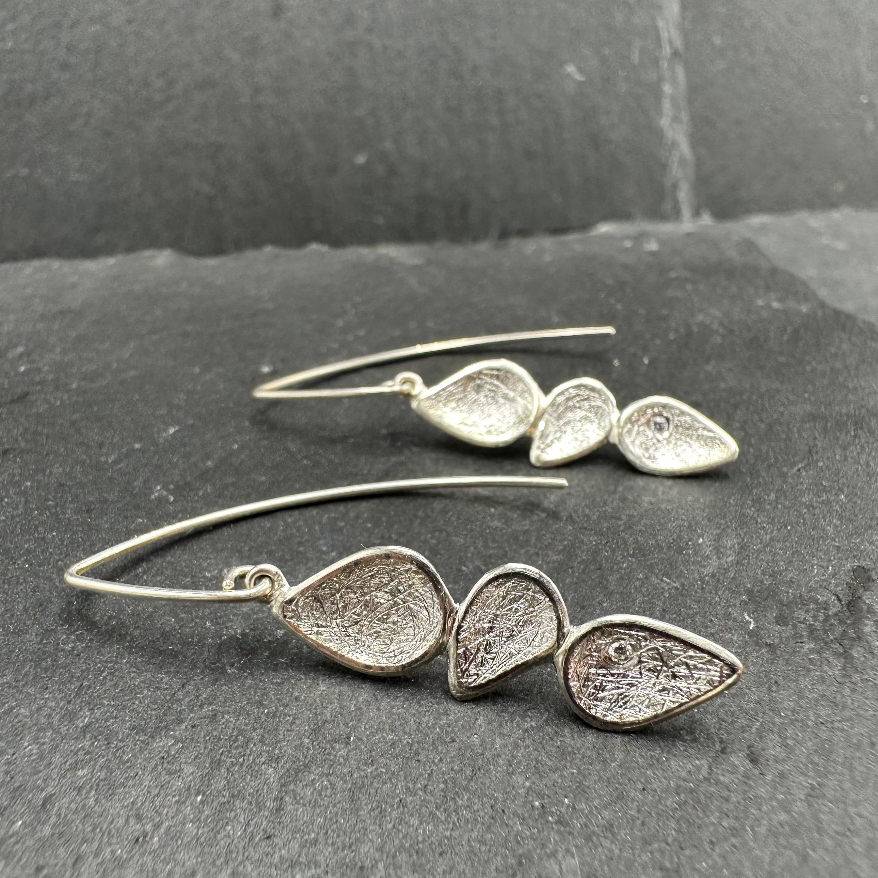 Three sterling silver teardrop shapes have been soldered together to create these lovely earrings. A bright scratched texture is applied to highlight the depth of each shape, and a tiny 1mm white diamond accents the bottom teardrop for extra sparkle.