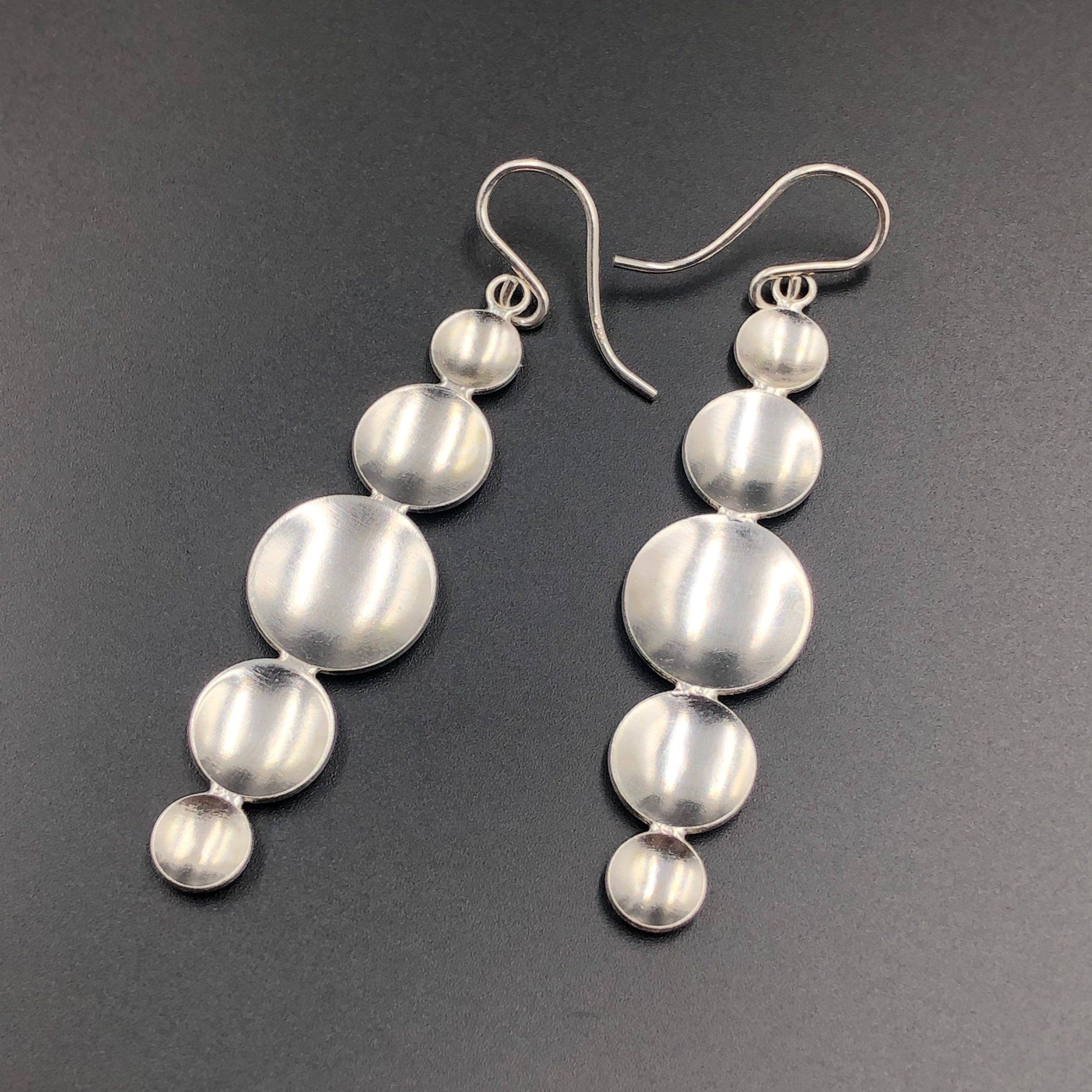 Five sterling silver domed discs hang on sterling silver earwires. These earrings are 2.25 inches in length and are handmade in Denver, CO, USA