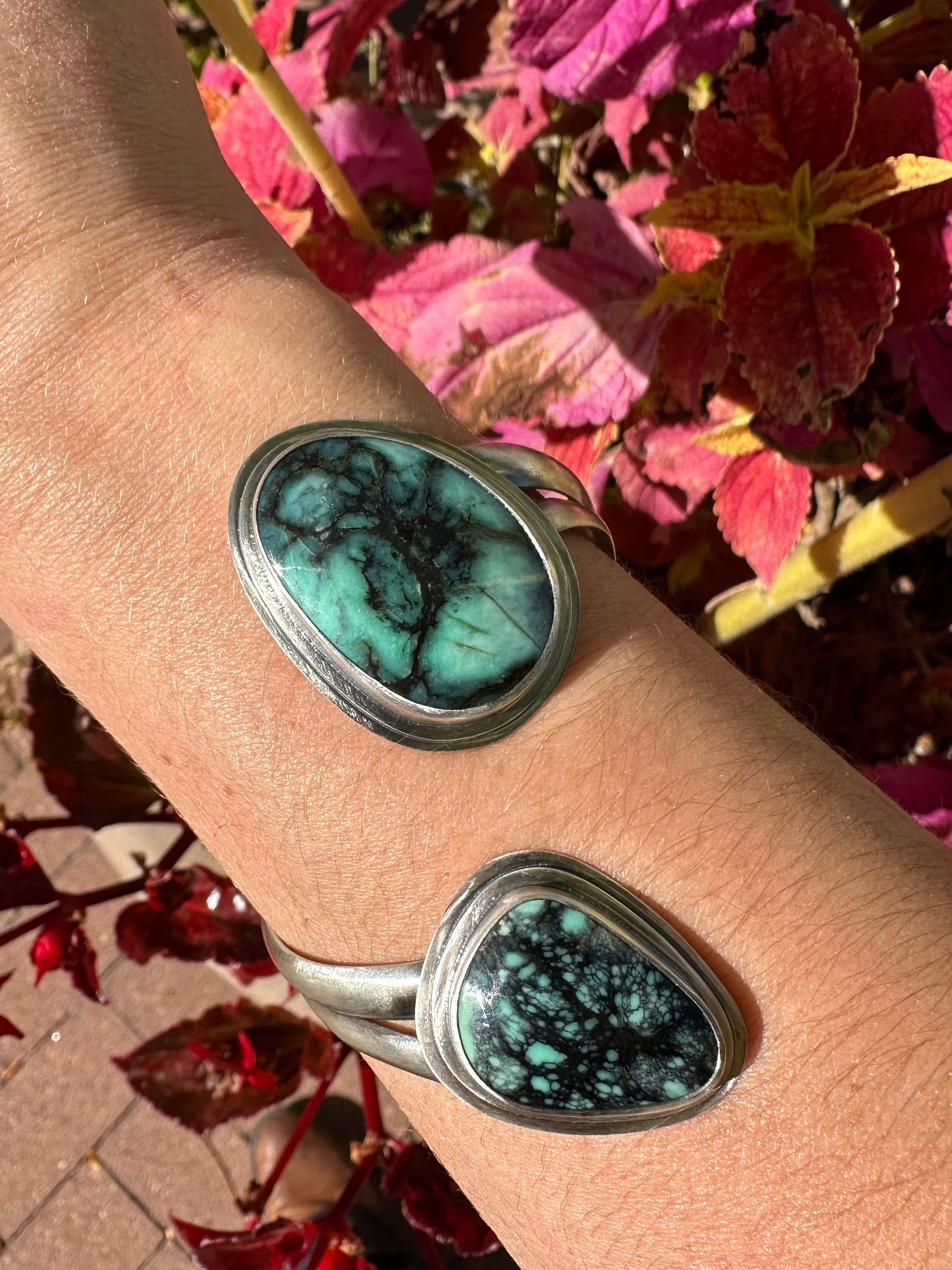 This uniquely shaped bracelet features two snowville variscite cabochons that are bezel-set on a split shank-style cuff. The twisted design and offset stones resemble a harmony or yin-yang symbol. We recommend trying this cuff on in person before purchasing, as the sizing can be tricky; it is generally suited for a medium-sized wrist. To wear it, insert your wrist sideways between the two stones and then gently squeeze to fit. The larger stone measures approximately 1.5 inches long, while the smaller stone measures just over 1 inch long.