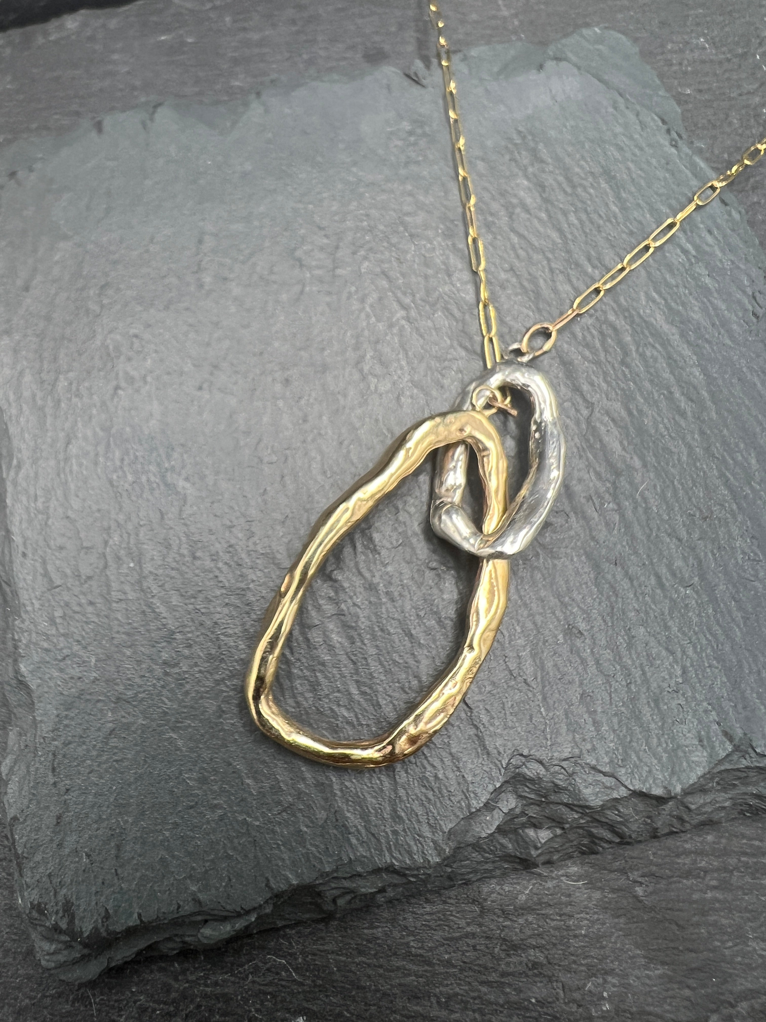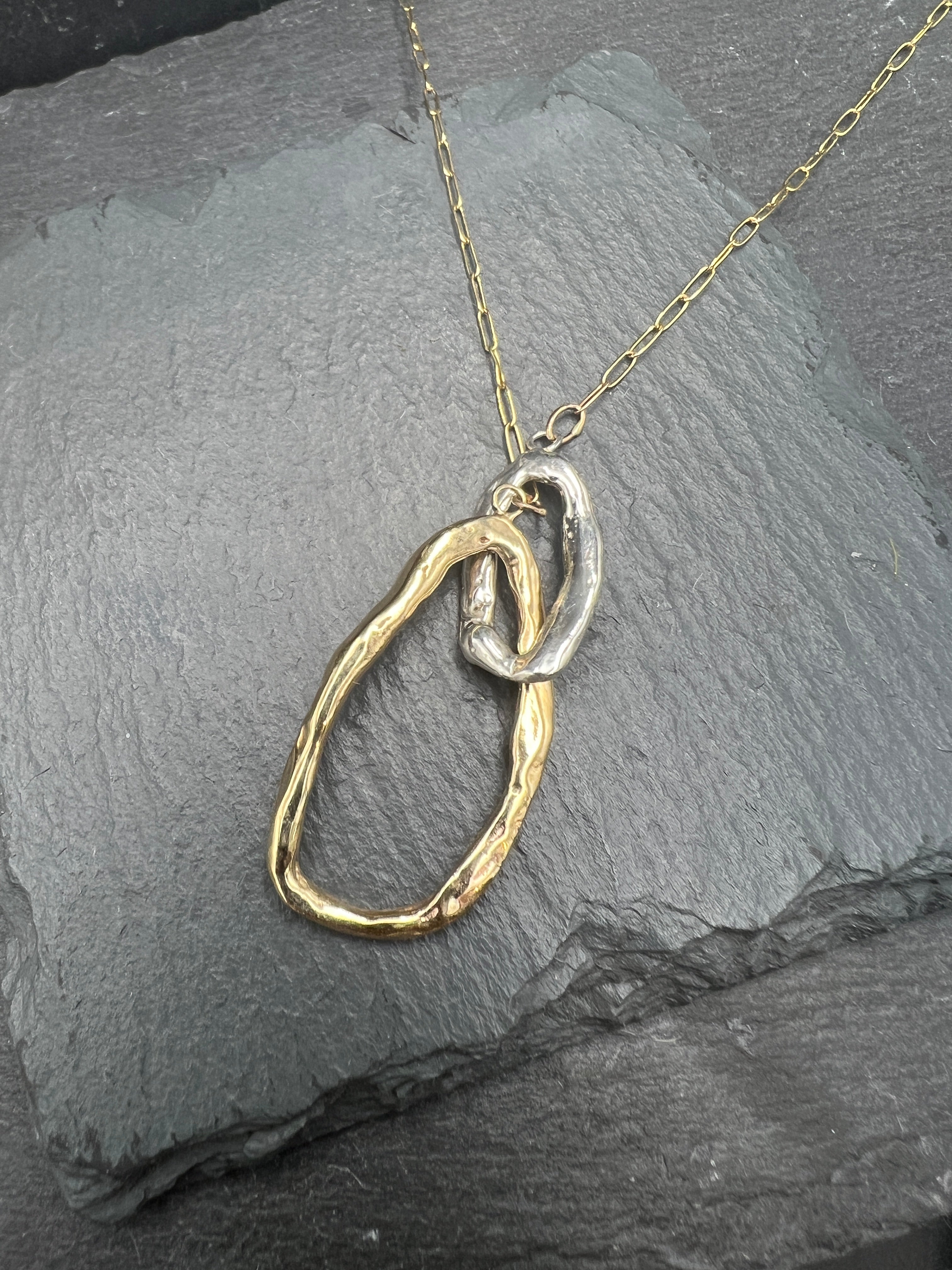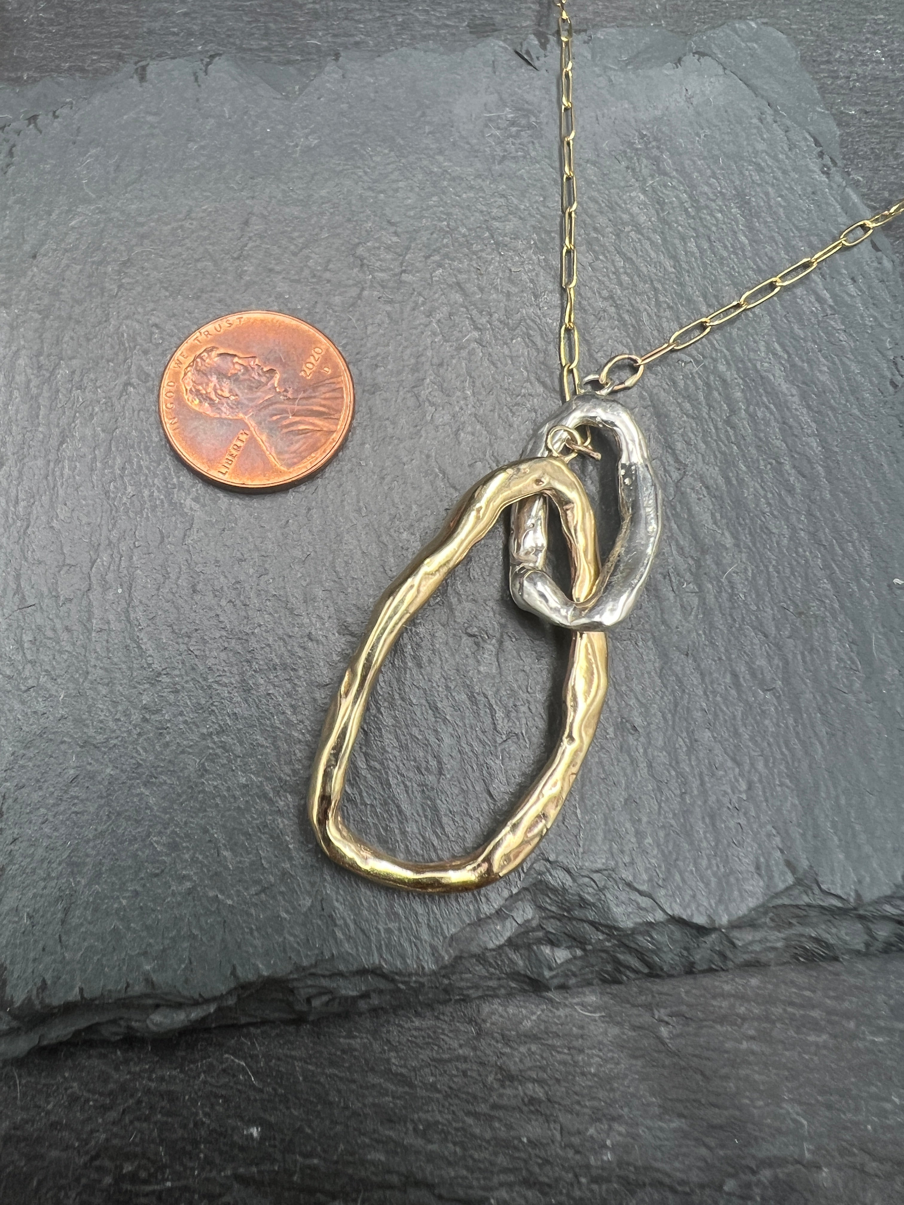 A lovely organically shaped brass and silver, interlocked oval double pendant, 2 inches wide on a gold fill chain.