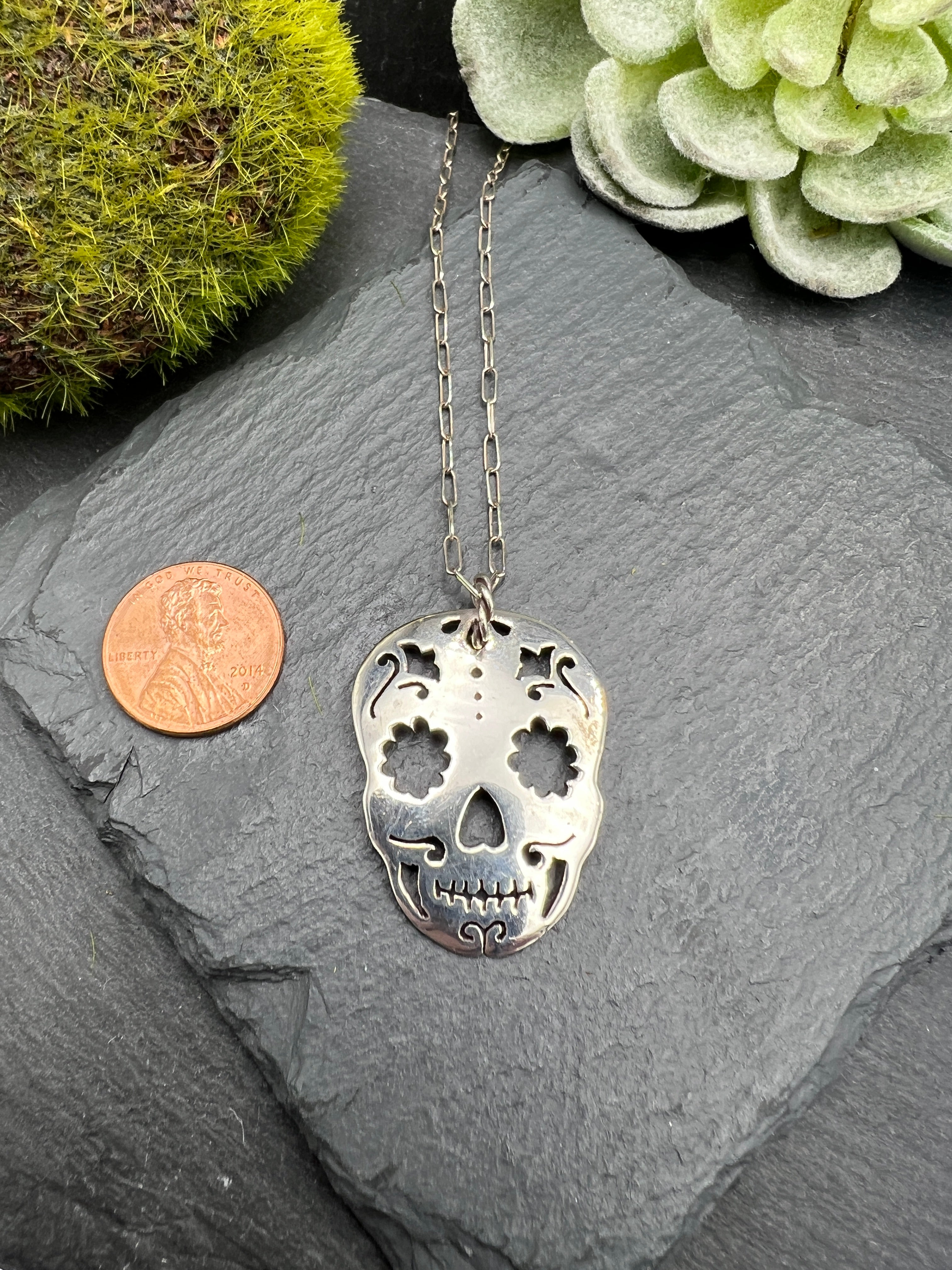 A hand pierced sterling silver sugar skull hangs on a sterling silver 18 inch chain. This pendant measures 1.25 inches by 1 inch.
