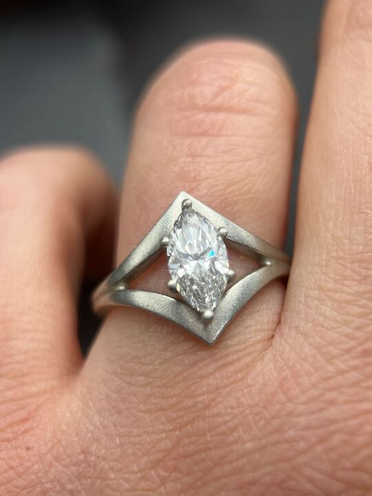 Simple, yet stunning, this gorgeous 14k white gold ring features a beautiful 1.04ct lab marquise diamond set in a split shank with a sandblasted finish. This ring is a size 6.5 and can be sized.
