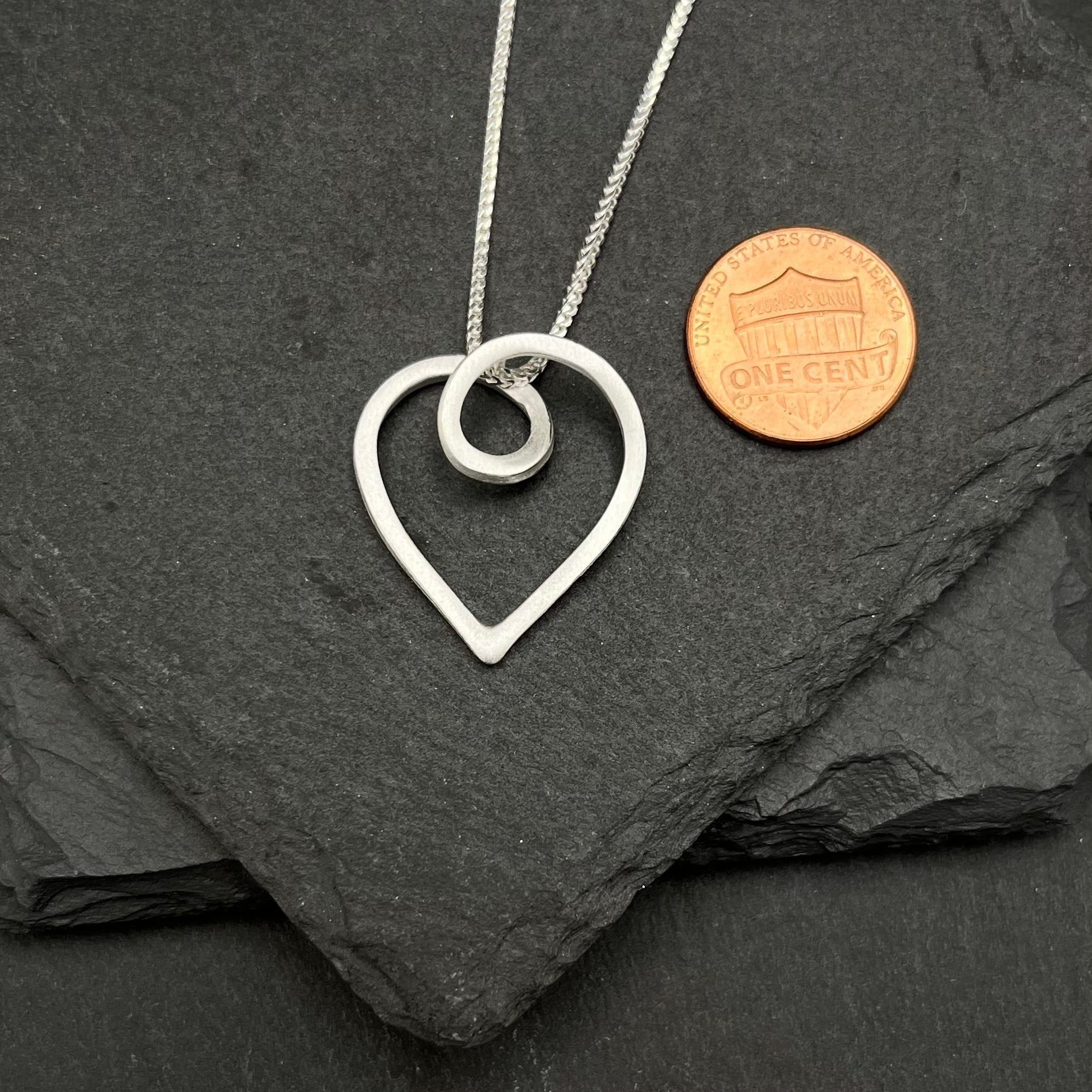 A single piece of brushed sterling silver is twisted into an abstracted heart shape that is just under 1 inch wide and hangs from a 18" sterling silver chain that is slide-adjustable to any smaller length.