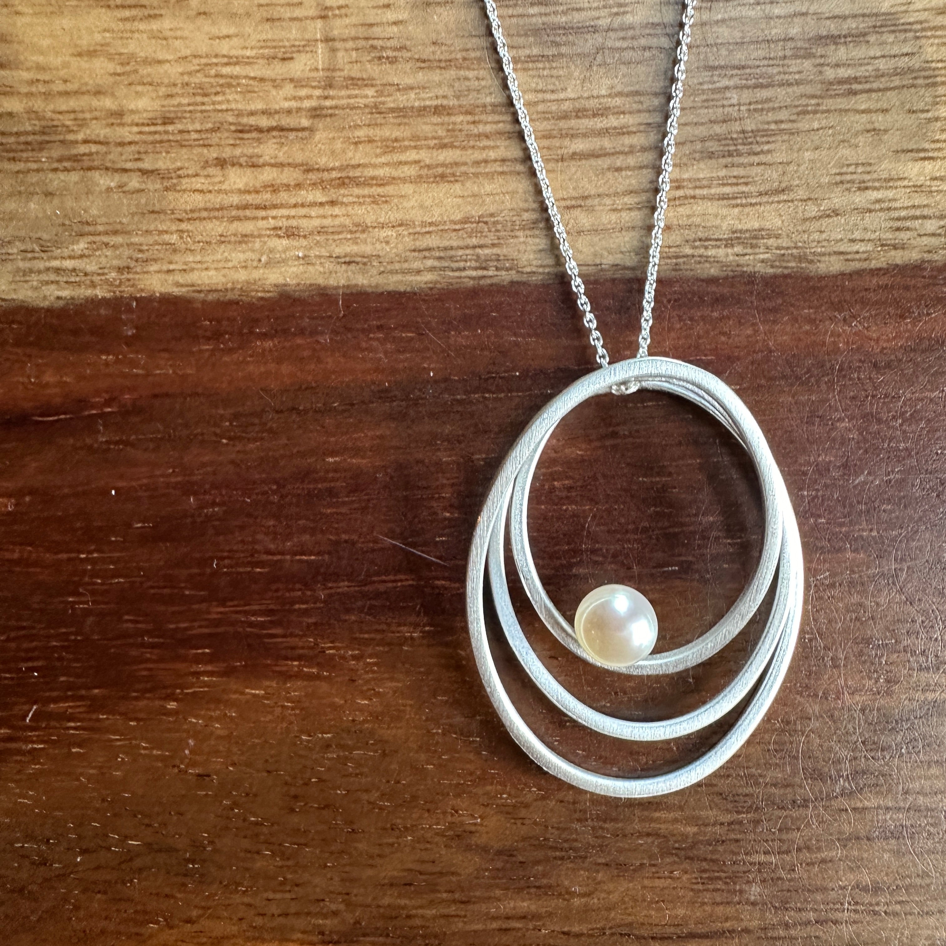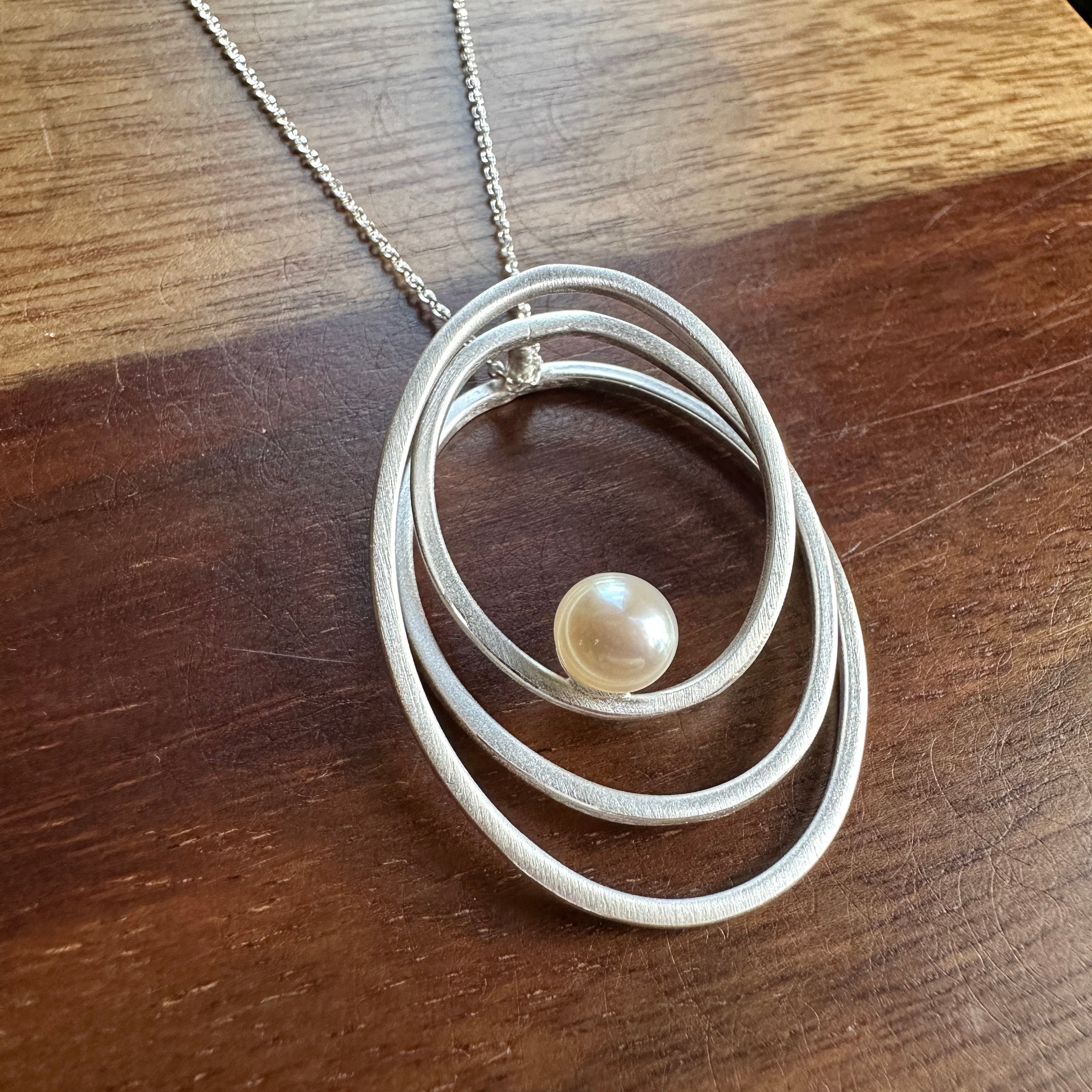 Three ovals of brushed sterling silver come together to emphasize a perfect freshwater pearl that seems to float inside the pendant. Pendant hangs from an 17 inch sterling silver chain.
