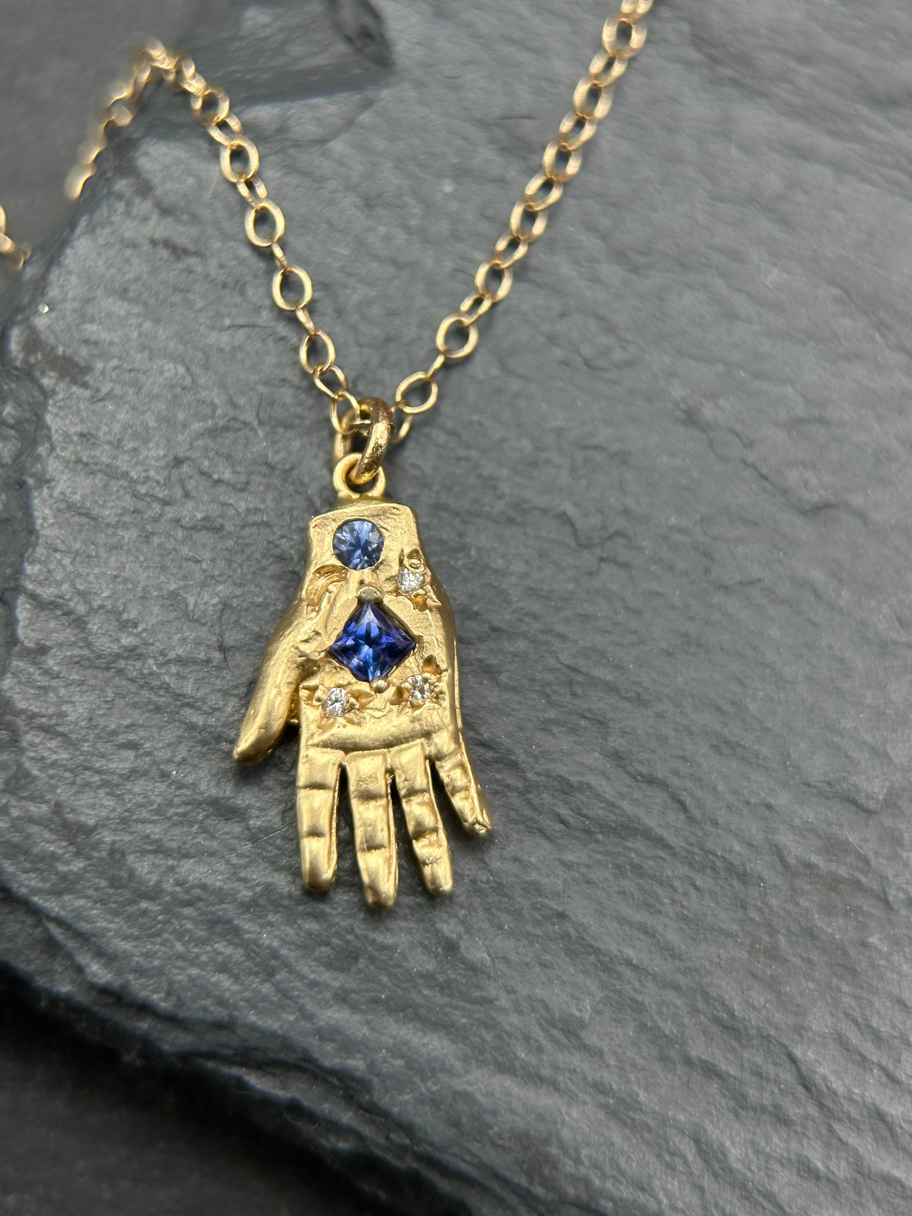 This 14k yellow gold pendant features a "McCall's Hand" or "Hand of God" with 2 beautiful blue sapphires (.10ct) in princess and round cuts, and a few scattered diamonds (.02ctw).