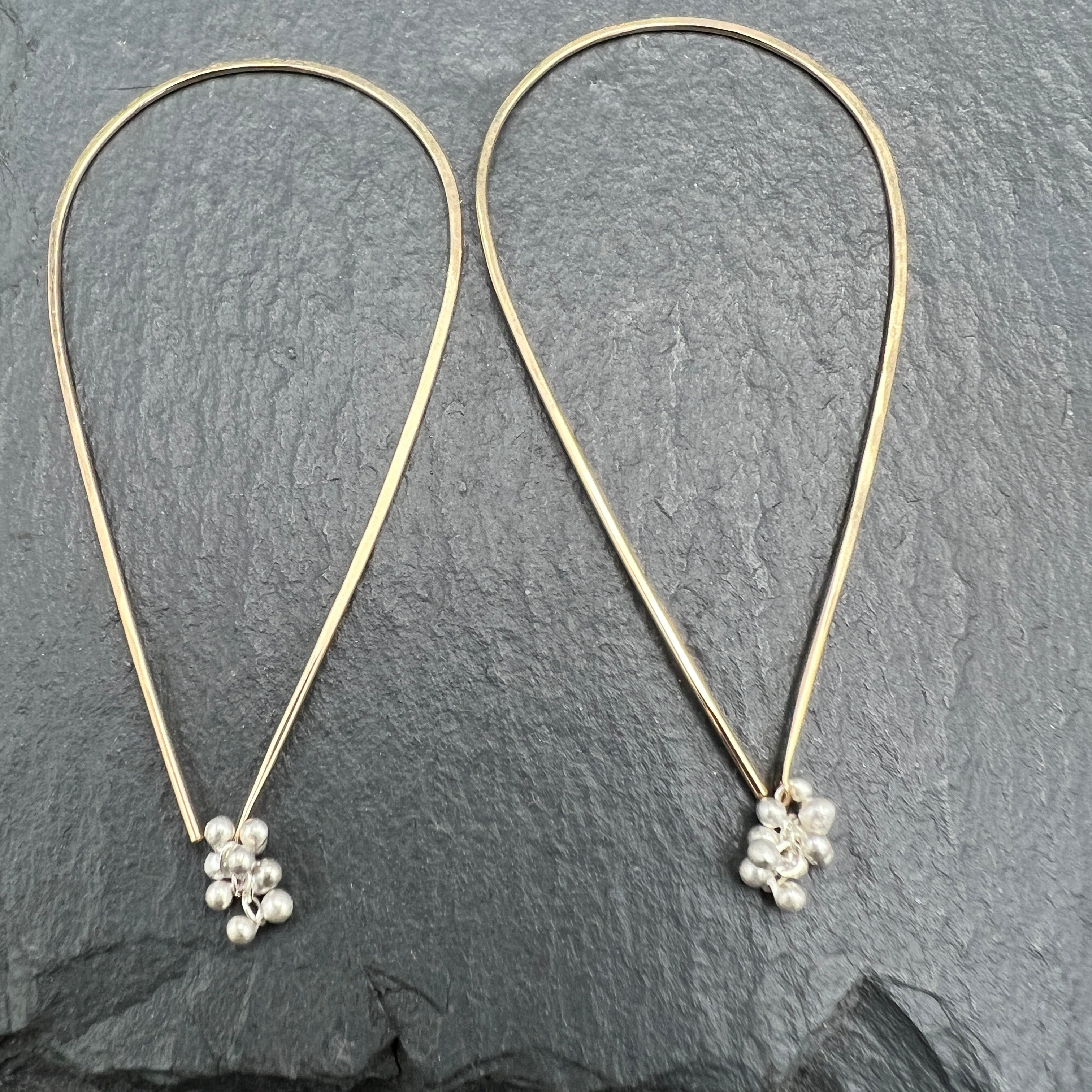 Gold fill wire is shaped into elongated tear-shaped ear wires with handmade sterling silver beads on the bottom, hanging 2.5 inches in length.